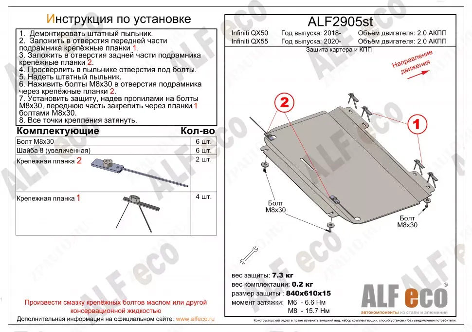 Защита картера и КПП (ALF2905al-1) Alfeco изготовлена из алюминия толщиной 4мм (алюминиевый сплав с примесями магния) специально для автомобиля Infiniti QX55 2020- . Данное изделие обеспечивает надежную защиту от механических воздействий, предохраняет подкапотное пространство от попадания грязи и пыли, а также способствует улучшению аэродинамики автомобиля за счет оптимизации обтекаемости моторного отсека снизу.