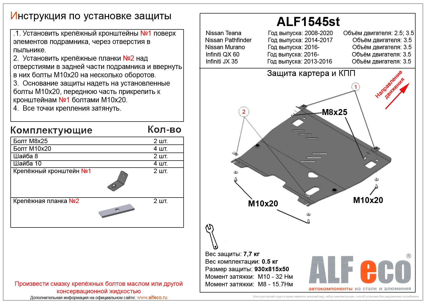 Защита картера и КПП ALFeco арт. ALF1545al-3 изготовлена из алюминия толщиной 4мм специально для автомобиля Nissan Teana (L33) 2014-2020. Обеспечивает надежную защиту агрегатов от механических повреждений и попадания дорожной грязи и других предметов, встречающихся на проезжей части, способных зачастую нанести серьезный вред автомобилю. В комплекте идет весь необходимый крепеж для установки. Наличие можно уточнить по телефону. Возможна установка в нашем автосервисе по предварительной записи