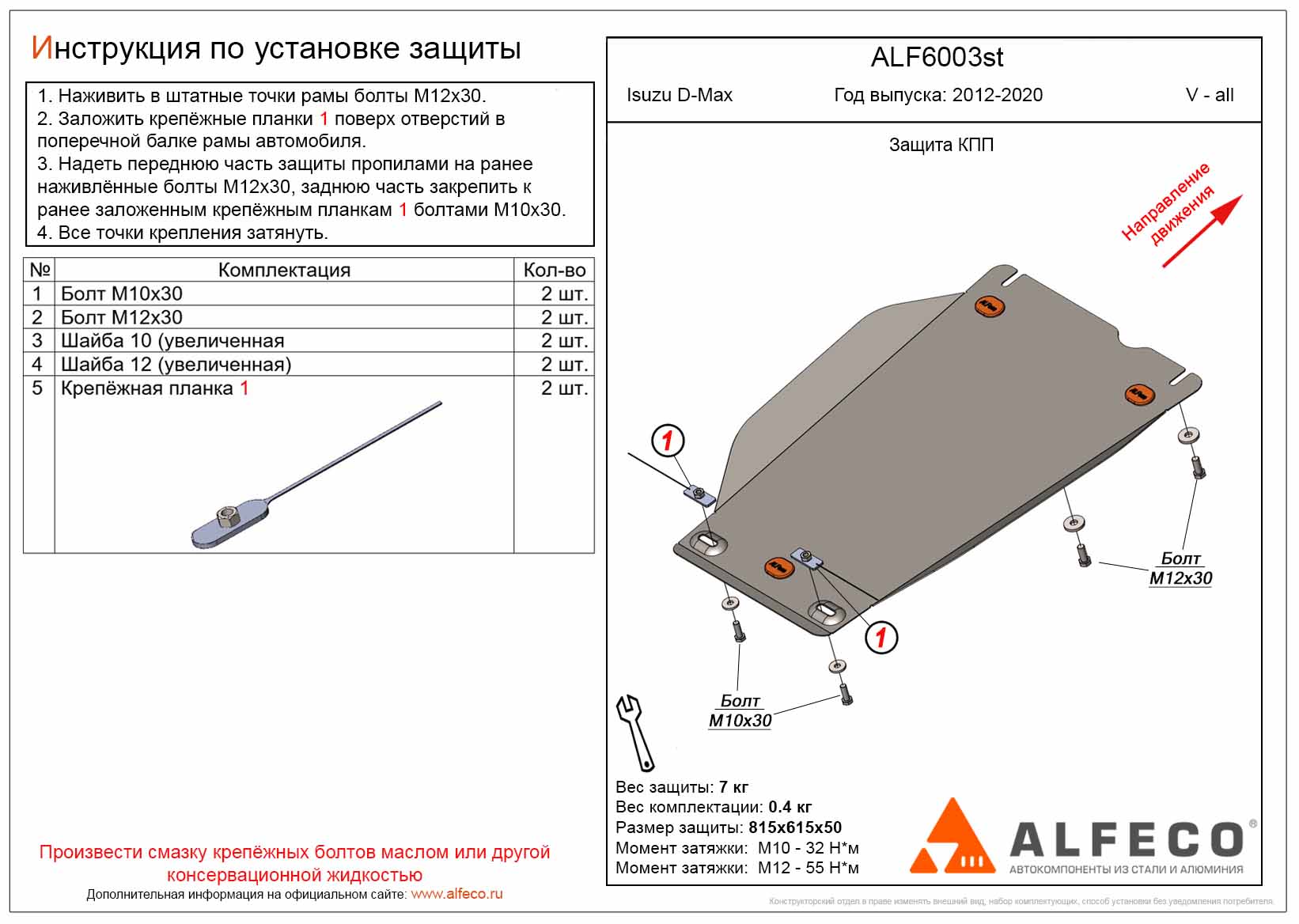 Защита КПП ALFeco арт. ALF6003al изготовлена из алюминия толщиной 4мм специально для автомобиля Isuzu D-Max 2012-2020. Обеспечивает надежную защиту агрегатов от механических повреждений и попадания дорожной грязи и других предметов, встречающихся на проезжей части, способных зачастую нанести серьезный вред автомобилю. В комплекте идет весь необходимый крепеж для установки. Наличие можно уточнить по телефону. Возможна установка в нашем автосервисе по предварительной записи