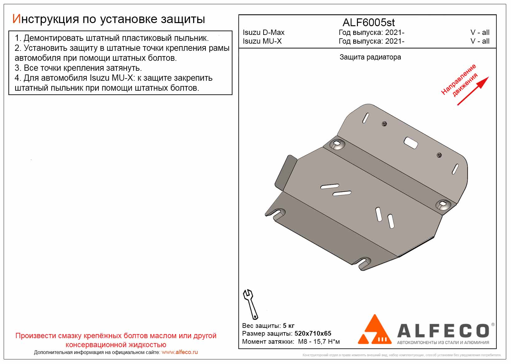 Защита радиатора ALFeco арт. ALF6005al изготовлена из алюминия толщиной 4мм специально для автомобиля Isuzu D-Max 2021-. Обеспечивает надежную защиту агрегатов от механических повреждений и попадания дорожной грязи и других предметов, встречающихся на проезжей части, способных зачастую нанести серьезный вред автомобилю. В комплекте идет весь необходимый крепеж для установки. Наличие можно уточнить по телефону. Возможна установка в нашем автосервисе по предварительной записи