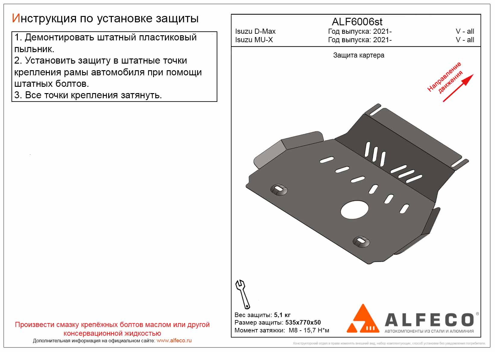 Защита картера ALFeco арт. ALF6006al изготовлена из алюминия толщиной 4мм специально для автомобиля Isuzu D-Max 2021-. Обеспечивает надежную защиту агрегатов от механических повреждений и попадания дорожной грязи и других предметов, встречающихся на проезжей части, способных зачастую нанести серьезный вред автомобилю. В комплекте идет весь необходимый крепеж для установки. Наличие можно уточнить по телефону. Возможна установка в нашем автосервисе по предварительной записи