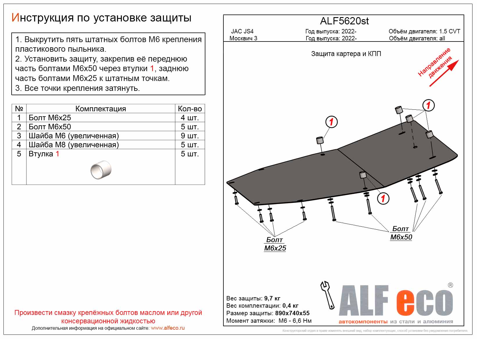 Защита картера и КПП ALFeco арт. ALF5620st изготовлена из стали толщиной 2мм специально для автомобиля Москвич 3 2022-. Обеспечивает надежную защиту агрегатов от механических повреждений и попадания дорожной грязи и других предметов, встречающихся на проезжей части, способных зачастую нанести серьезный вред автомобилю. В комплекте идет весь необходимый крепеж для установки. Наличие можно уточнить по телефону. Возможна установка в нашем автосервисе по предварительной записи