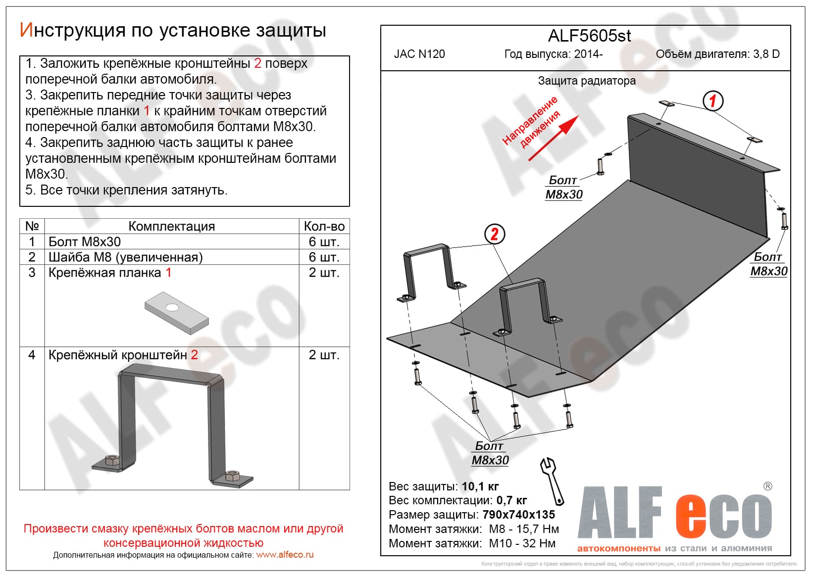 Защита радиатора (ALF5605st) Alfeco изготовлена из стали толщиной 2мм специально для автомобиля JAC N120 2014- . Данное изделие обеспечивает надежную защиту от механических воздействий, предохраняет подкапотное пространство от попадания грязи и пыли, а также способствует улучшению аэродинамики автомобиля за счет оптимизации обтекаемости моторного отсека снизу. После установки защиты обычный температурный режим работы двигателя и других агрегатов не изменяется.