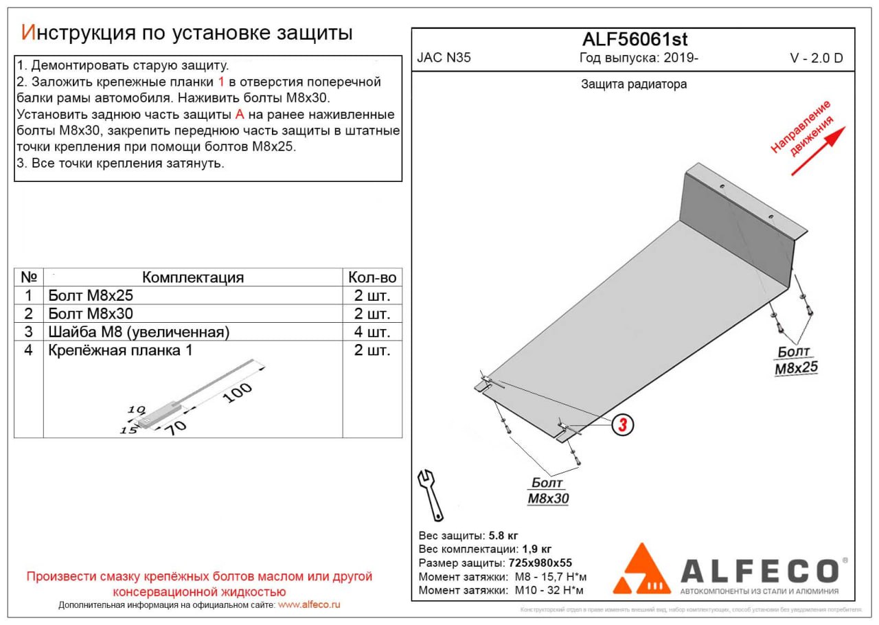 Защита радиатора ALFeco арт. ALF56061al изготовлена из алюминия толщиной 4мм специально для автомобиля JAC N35 2019- . Обеспечивает надежную защиту агрегатов от механических повреждений и попадания дорожной грязи и других предметов, встречающихся на проезжей части, способных зачастую нанести серьезный вред автомобилю. В комплекте идет весь необходимый крепеж для установки. Наличие можно уточнить по телефону. Возможна установка в нашем автосервисе по предварительной записи