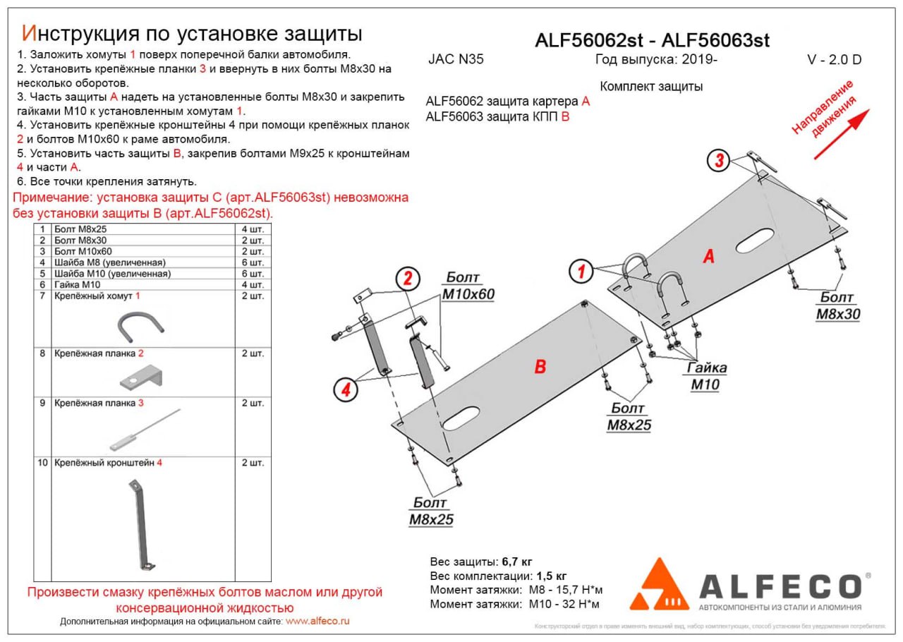 Защита КПП (установка невозможна без ALF56062st) ALFeco арт. ALF56063st изготовлена из стали толщиной 2мм специально для автомобиля JAC N35 2019- . Обеспечивает надежную защиту агрегатов от механических повреждений и попадания дорожной грязи и других предметов, встречающихся на проезжей части, способных зачастую нанести серьезный вред автомобилю. В комплекте идет весь необходимый крепеж для установки. Наличие можно уточнить по телефону. Возможна установка в нашем автосервисе по предварительной записи