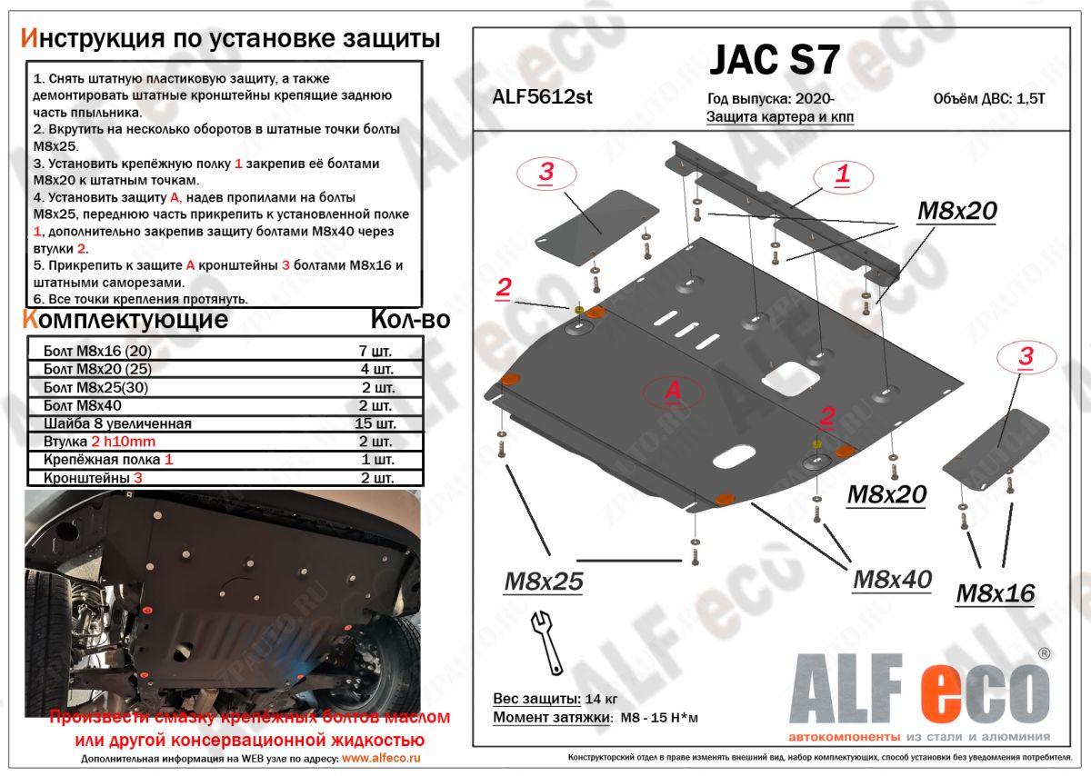 Защита картера и кпп (ALF5612al) Alfeco изготовлена из алюминия толщиной 4мм (алюминиевый сплав с примесями магния) специально для автомобиля JAC S7 2020- . Данное изделие обеспечивает надежную защиту от механических воздействий, предохраняет подкапотное пространство от попадания грязи и пыли, а также способствует улучшению аэродинамики автомобиля за счет оптимизации обтекаемости моторного отсека снизу.
