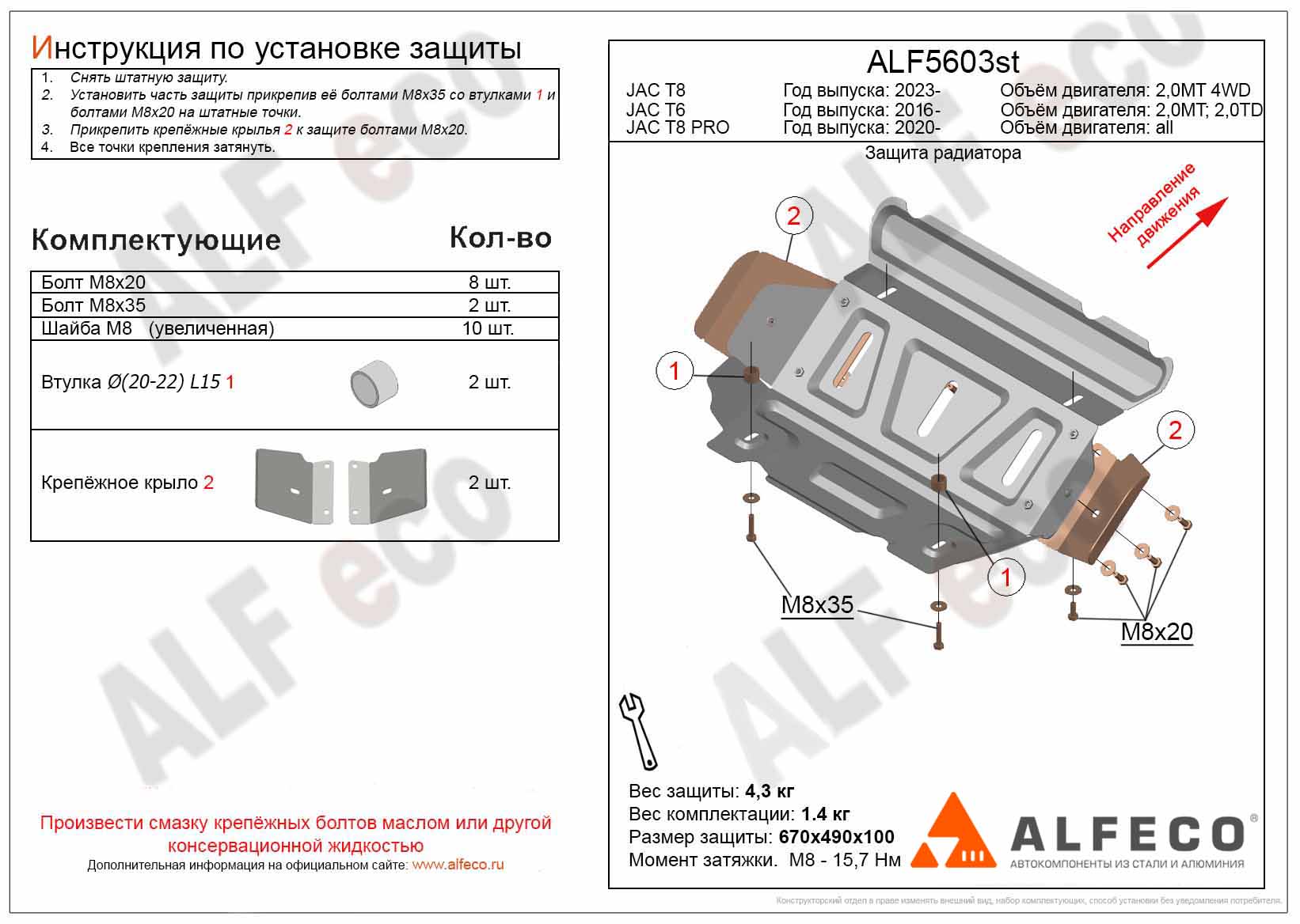 Защита радиатора ALFeco арт. ALF5603st изготовлена из стали толщиной 2мм специально для автомобиля JAC T8 PRO 2020-. Обеспечивает надежную защиту агрегатов от механических повреждений и попадания дорожной грязи и других предметов, встречающихся на проезжей части, способных зачастую нанести серьезный вред автомобилю. В комплекте идет весь необходимый крепеж для установки. Наличие можно уточнить по телефону. Возможна установка в нашем автосервисе по предварительной записи