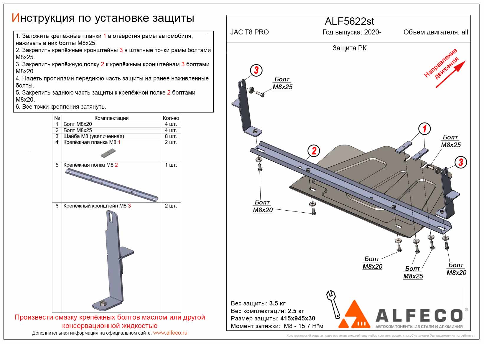 Защита РК ALFeco арт. ALF5622al изготовлена из алюминия толщиной 4мм специально для автомобиля JAC T8 PRO 2020-. Обеспечивает надежную защиту агрегатов от механических повреждений и попадания дорожной грязи и других предметов, встречающихся на проезжей части, способных зачастую нанести серьезный вред автомобилю. В комплекте идет весь необходимый крепеж для установки. Наличие можно уточнить по телефону. Возможна установка в нашем автосервисе по предварительной записи