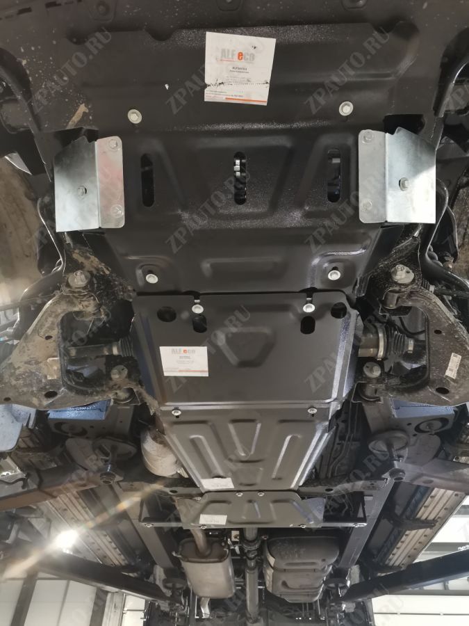 Защита комплект защиты (радиатор, картер, КПП, РК (4 части)) ALFeco арт. ALF5624st изготовлена из стали толщиной 2мм специально для автомобиля JAC T8 PRO 2020-. Обеспечивает надежную защиту агрегатов от механических повреждений и попадания дорожной грязи и других предметов, встречающихся на проезжей части, способных зачастую нанести серьезный вред автомобилю.