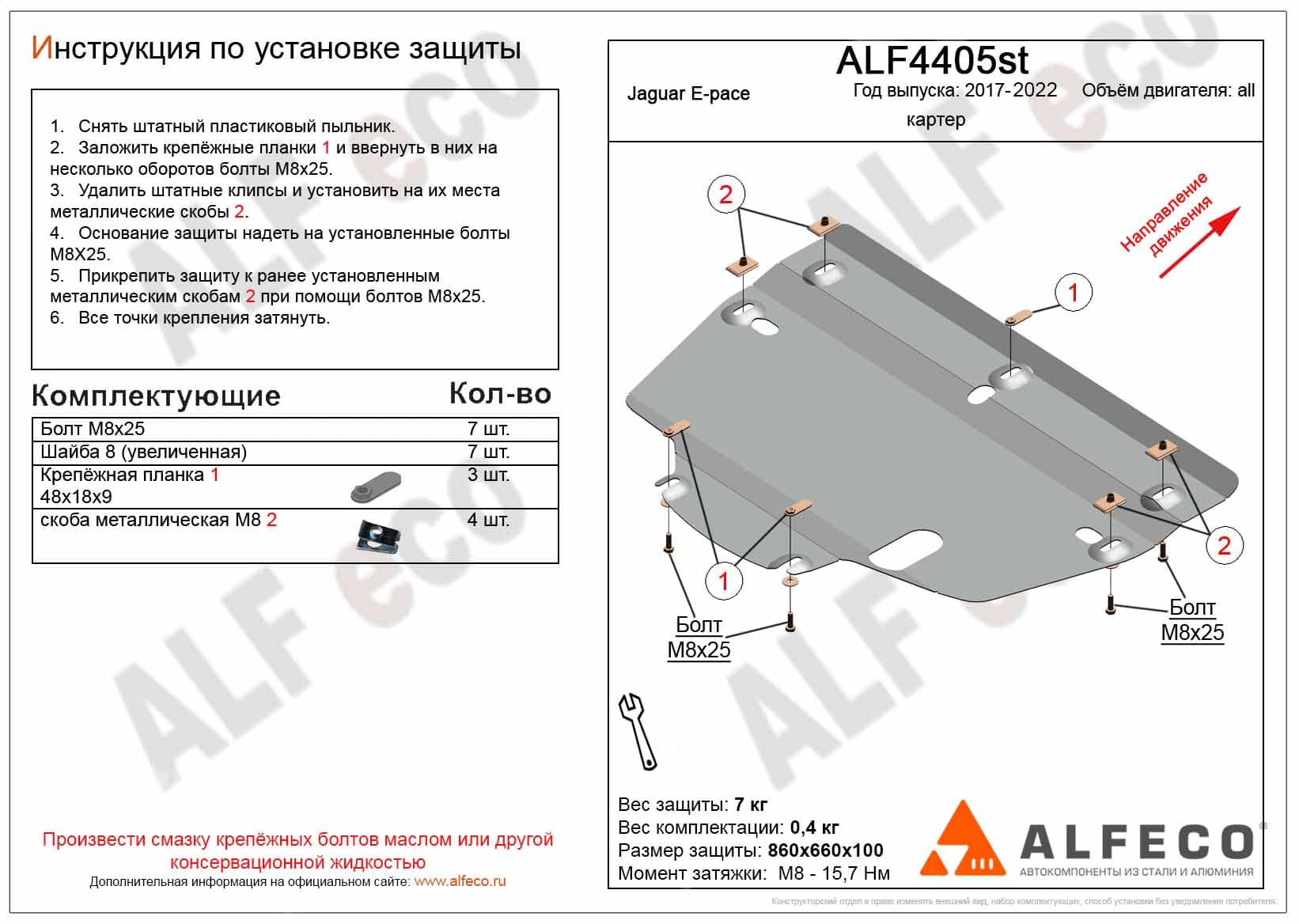 Защита картера и КПП ALFeco арт. ALF4405al изготовлена из алюминия толщиной 4мм специально для автомобиля Jaguar E-pace 2017-. Обеспечивает надежную защиту агрегатов от механических повреждений и попадания дорожной грязи и других предметов, встречающихся на проезжей части, способных зачастую нанести серьезный вред автомобилю. В комплекте идет весь необходимый крепеж для установки. Наличие можно уточнить по телефону. Возможна установка в нашем автосервисе по предварительной записи