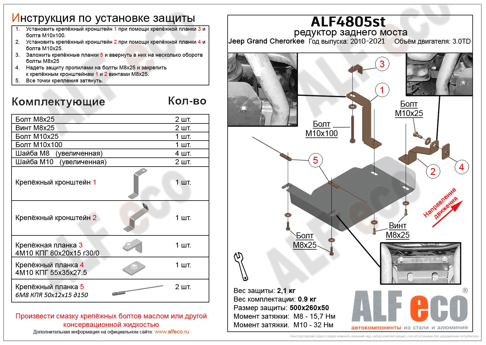 Защита редуктора заднего моста ALFeco арт. ALF4805st изготовлена из стали толщиной 2мм специально для автомобиля Jeep Grand Cherokee 2013-2018. Обеспечивает надежную защиту агрегатов от механических повреждений и попадания дорожной грязи и других предметов, встречающихся на проезжей части, способных зачастую нанести серьезный вред автомобилю. В комплекте идет весь необходимый крепеж для установки. Наличие можно уточнить по телефону. Возможна установка в нашем автосервисе по предварительной записи