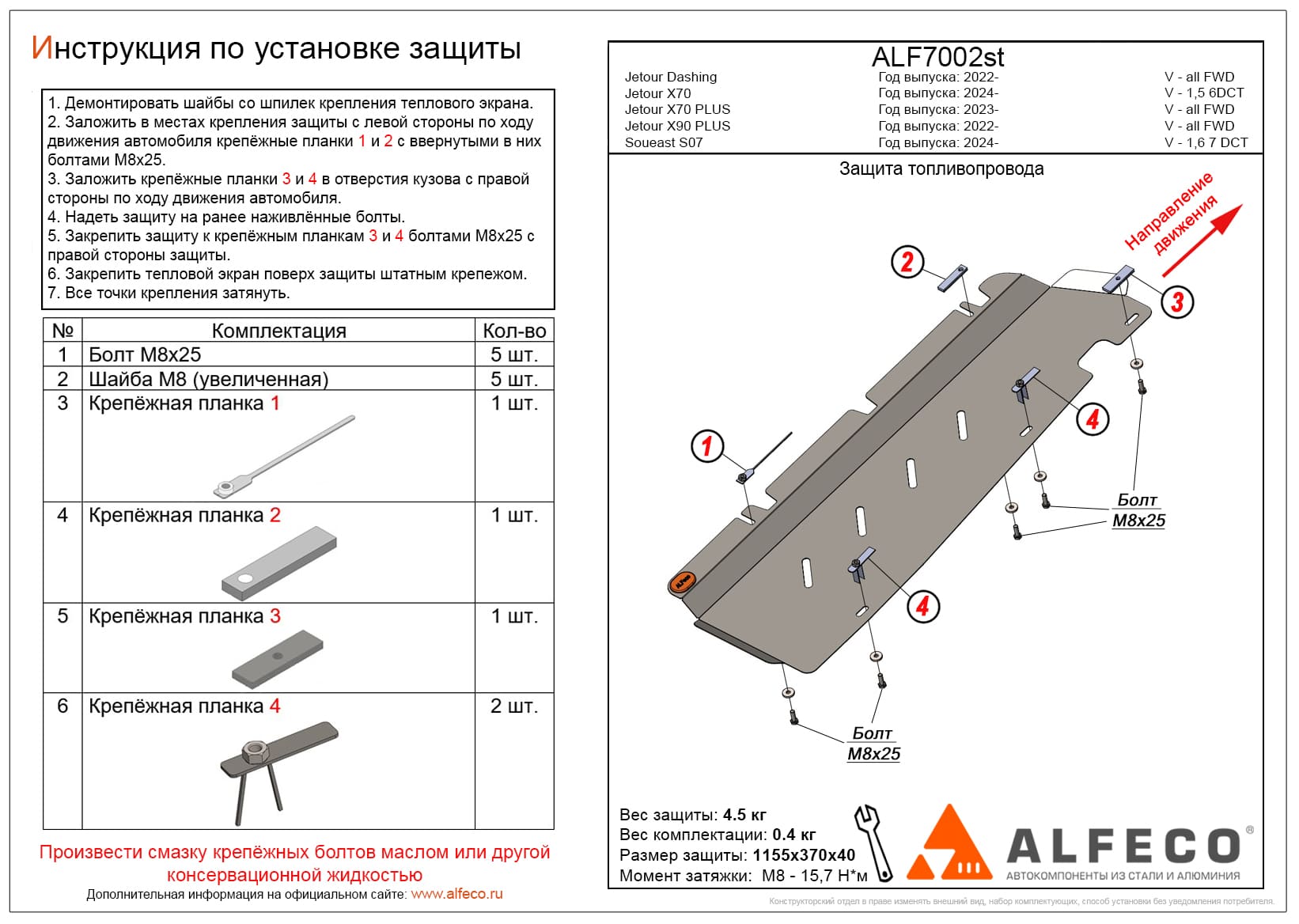 Защита топливопровода ALFeco арт. ALF7002st-3 изготовлена из стали толщиной 1.5 мм специально для автомобиля Jetour X70 2024- . Обеспечивает надежную защиту агрегатов от механических повреждений и попадания дорожной грязи и других предметов, встречающихся на проезжей части, способных зачастую нанести серьезный вред автомобилю. В комплекте идет весь необходимый крепеж для установки. Наличие можно уточнить по телефону. Возможна установка в нашем автосервисе по предварительной записи