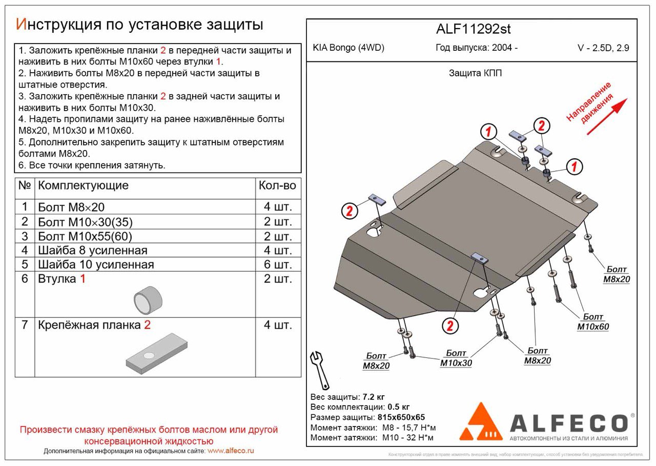 Защита КПП ALFeco арт. ALF11292al изготовлена из алюминия толщиной 4мм специально для автомобиля Kia Bongo 4WD 2004-. Обеспечивает надежную защиту агрегатов от механических повреждений и попадания дорожной грязи и других предметов, встречающихся на проезжей части, способных зачастую нанести серьезный вред автомобилю. В комплекте идет весь необходимый крепеж для установки. Наличие можно уточнить по телефону. Возможна установка в нашем автосервисе по предварительной записи