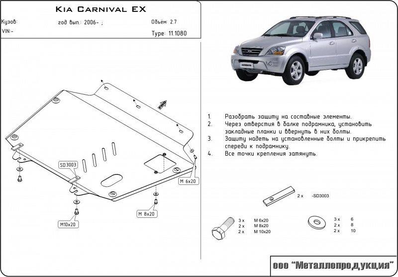 Приобретая стальную защиту 11.1080 для KIA Carnival 2006 - 2014, вы можете установить ее в нашем сервисе. Стоимость установки от 1100 рублей за лист, предварительно необходимо записаться по телефону на удобное для вас время.