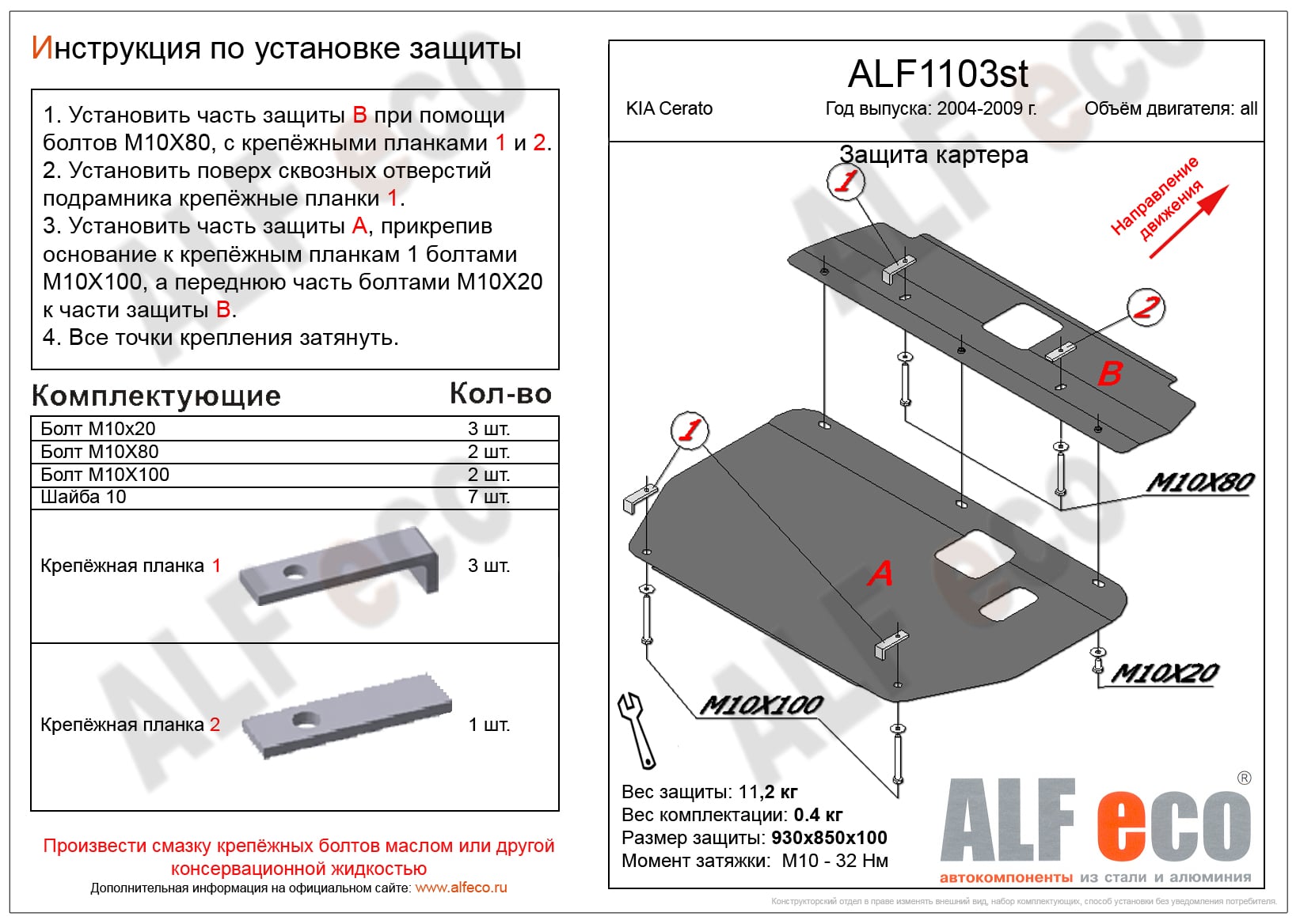 Защита картера и КПП (2 части) ALFeco арт. ALF1103st изготовлена из стали толщиной 2мм специально для автомобиля Kia Cerato I 2004-2009. Обеспечивает надежную защиту агрегатов от механических повреждений и попадания дорожной грязи и других предметов, встречающихся на проезжей части, способных зачастую нанести серьезный вред автомобилю.