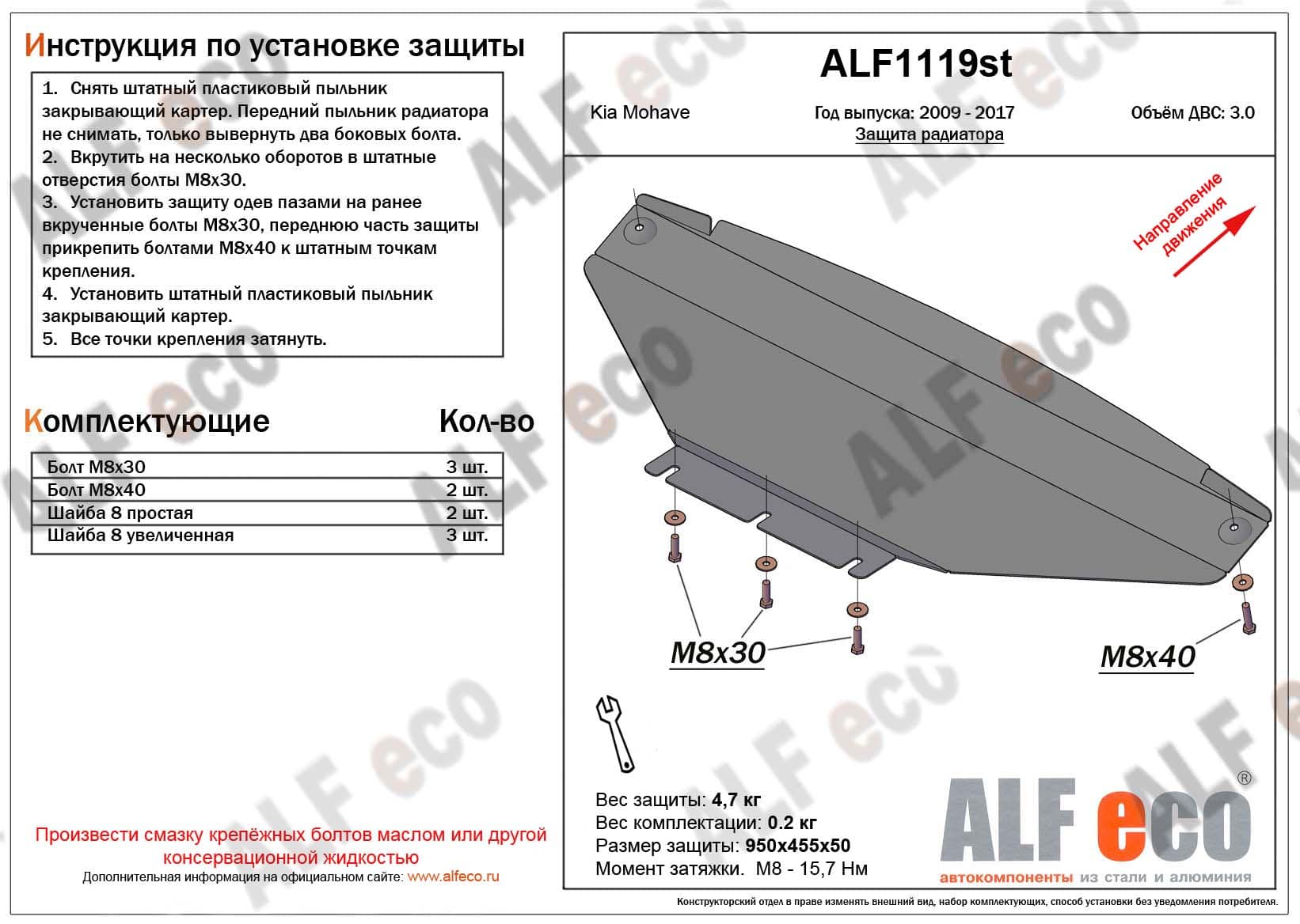 Защита радиатора ALFeco арт. ALF1119al изготовлена из алюминия толщиной 4мм специально для автомобиля Kia Mohave (HM) 2009-2017. Обеспечивает надежную защиту агрегатов от механических повреждений и попадания дорожной грязи и других предметов, встречающихся на проезжей части, способных зачастую нанести серьезный вред автомобилю. В комплекте идет весь необходимый крепеж для установки. Наличие можно уточнить по телефону. Возможна установка в нашем автосервисе по предварительной записи