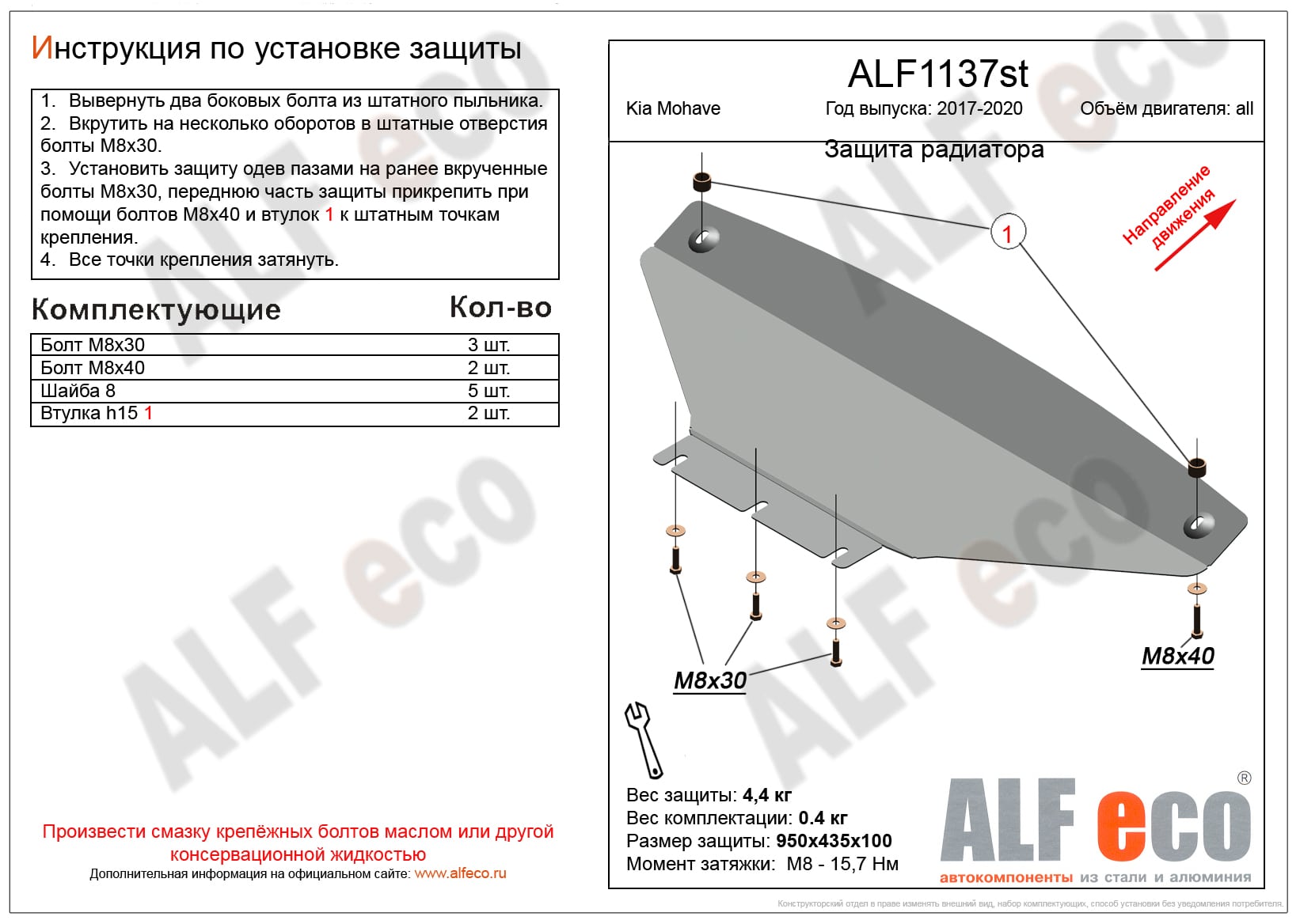 Защита радиатора ALFeco арт. ALF1137al изготовлена из алюминия толщиной 4мм специально для автомобиля Kia Mohave (HM) рестайлинг 2017-2020. Обеспечивает надежную защиту агрегатов от механических повреждений и попадания дорожной грязи и других предметов, встречающихся на проезжей части, способных зачастую нанести серьезный вред автомобилю. В комплекте идет весь необходимый крепеж для установки. Наличие можно уточнить по телефону. Возможна установка в нашем автосервисе по предварительной записи