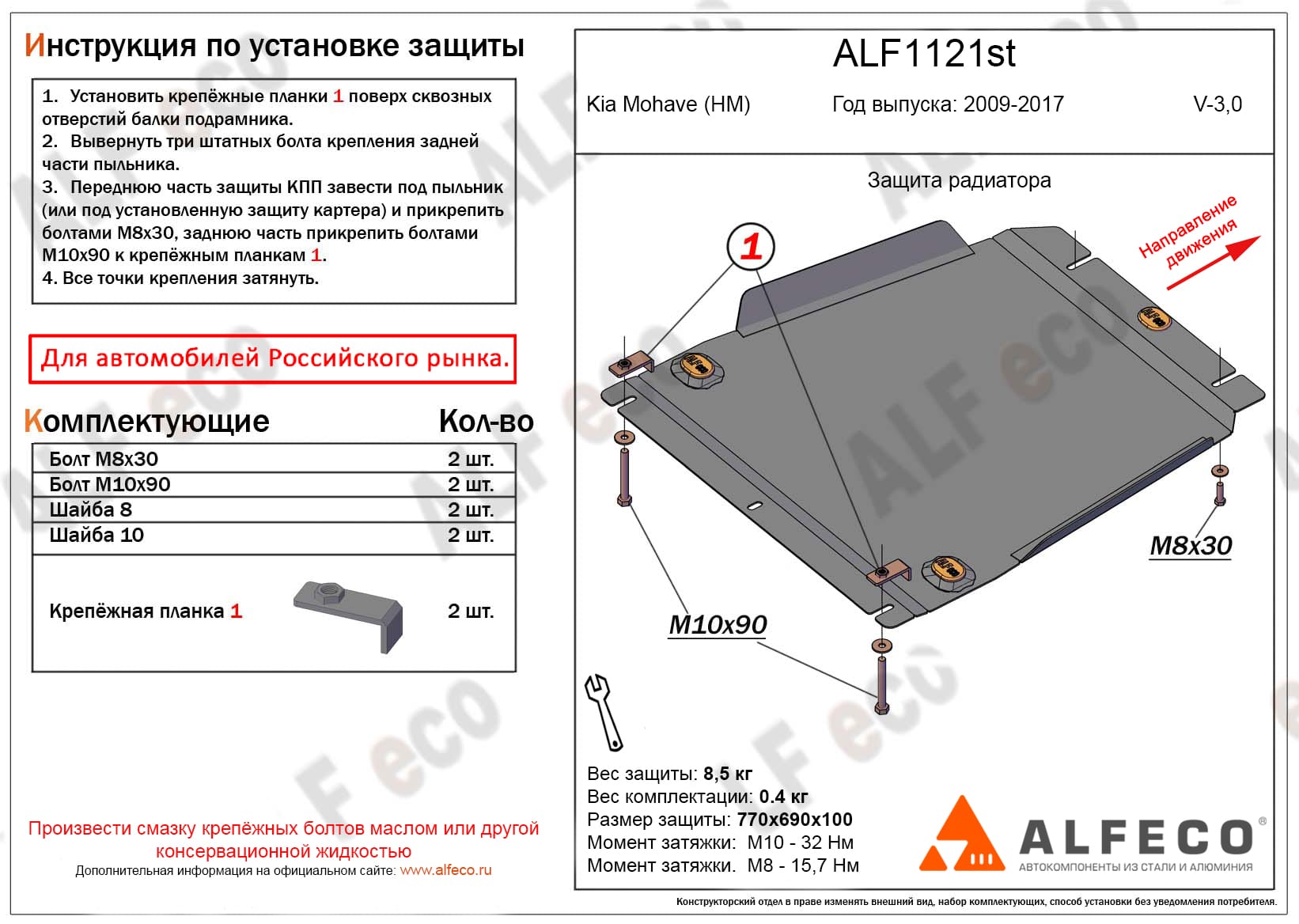 Защита КПП ALFeco арт. ALF1121st-2 изготовлена из стали толщиной 2мм специально для автомобиля Kia Mohave (HM2) 2020-2022. Обеспечивает надежную защиту агрегатов от механических повреждений и попадания дорожной грязи и других предметов, встречающихся на проезжей части, способных зачастую нанести серьезный вред автомобилю. В комплекте идет весь необходимый крепеж для установки. Наличие можно уточнить по телефону. Возможна установка в нашем автосервисе по предварительной записи