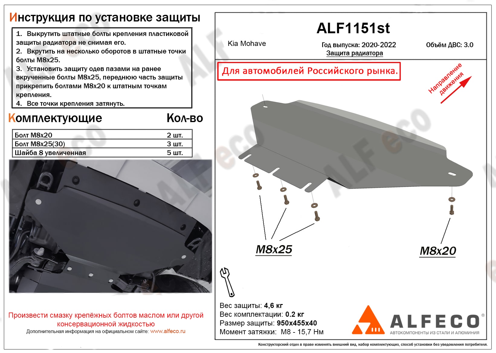 Защита радиатора ALFeco арт. ALF1151al изготовлена из алюминия толщиной 4мм специально для автомобиля Kia Mohave (HM2) 2020-2022. Обеспечивает надежную защиту агрегатов от механических повреждений и попадания дорожной грязи и других предметов, встречающихся на проезжей части, способных зачастую нанести серьезный вред автомобилю. В комплекте идет весь необходимый крепеж для установки. Наличие можно уточнить по телефону. Возможна установка в нашем автосервисе по предварительной записи