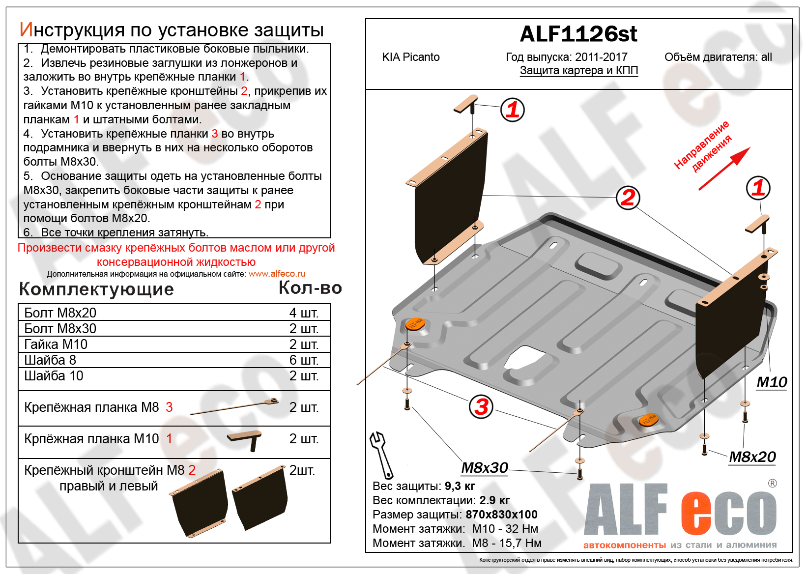 Защита картера и КПП ALFeco арт. ALF1126st изготовлена из стали толщиной 2мм специально для автомобиля Kia Picanto II (TA) 2011-2017. Обеспечивает надежную защиту агрегатов от механических повреждений и попадания дорожной грязи и других предметов, встречающихся на проезжей части, способных зачастую нанести серьезный вред автомобилю. В комплекте идет весь необходимый крепеж для установки. Наличие можно уточнить по телефону. Возможна установка в нашем автосервисе по предварительной записи