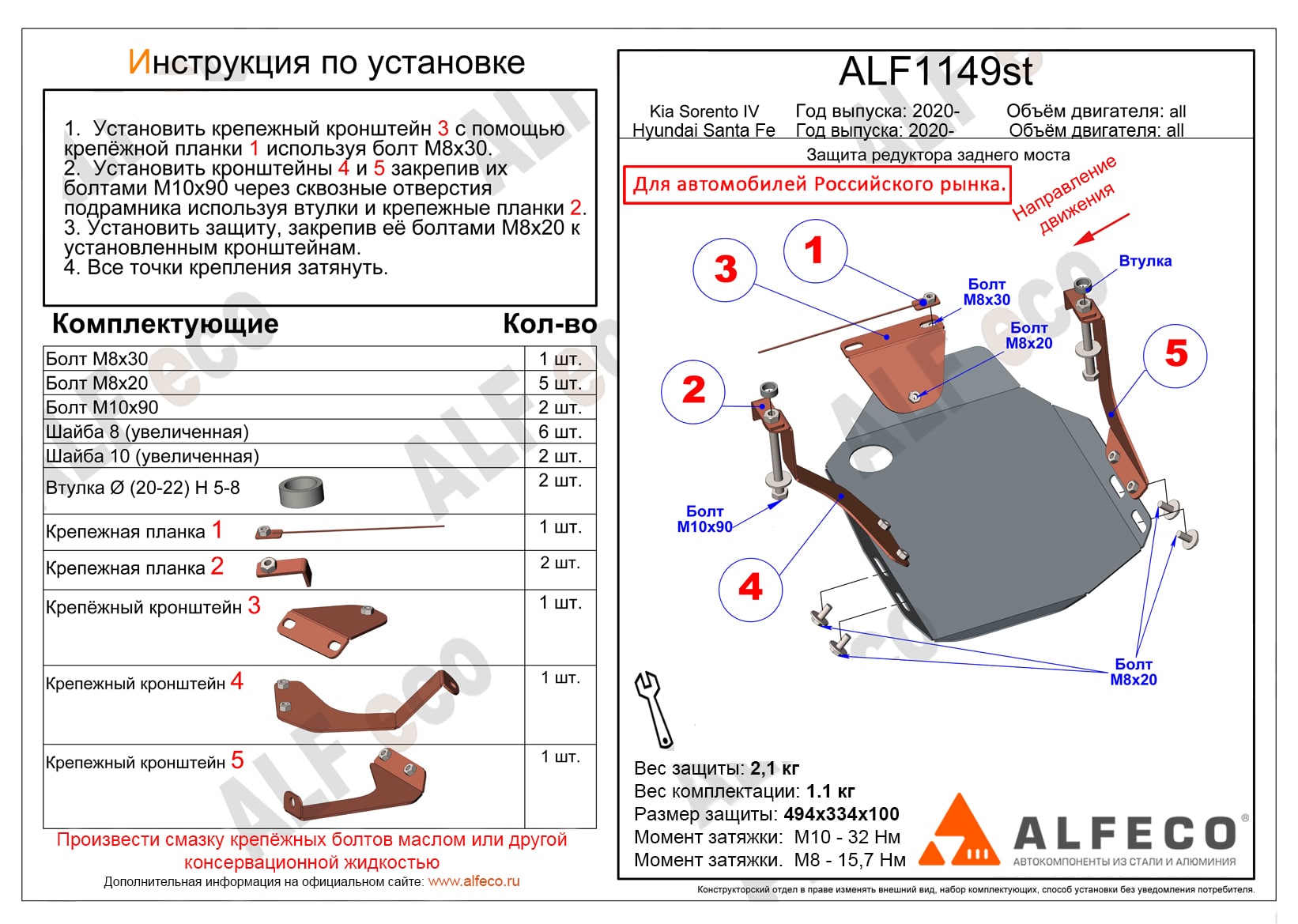 Защита редуктора заднего моста ALFeco арт. ALF1149st изготовлена из стали толщиной 2мм специально для автомобиля Kia Sorento IV 2020-2022. Обеспечивает надежную защиту агрегатов от механических повреждений и попадания дорожной грязи и других предметов, встречающихся на проезжей части, способных зачастую нанести серьезный вред автомобилю. В комплекте идет весь необходимый крепеж для установки. Наличие можно уточнить по телефону. Возможна установка в нашем автосервисе по предварительной записи