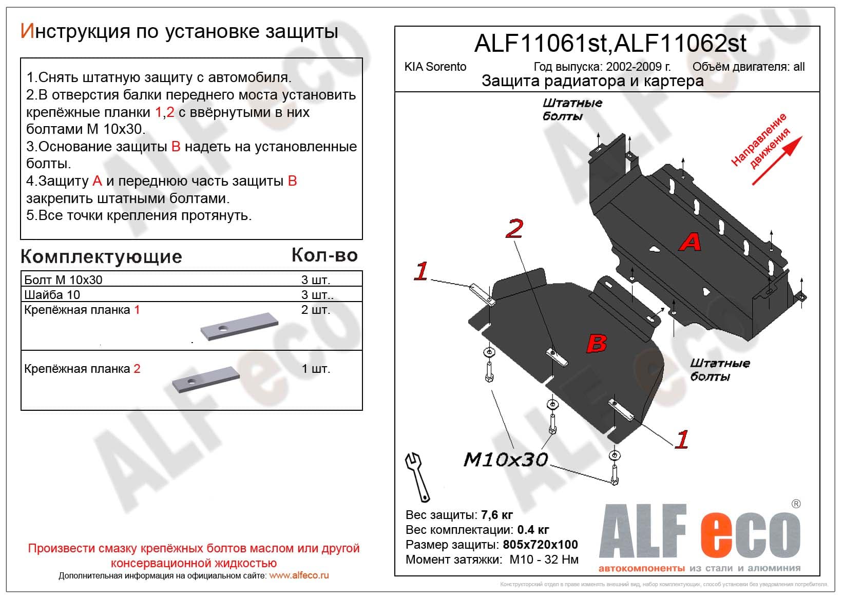 Защита радиатора ALFeco арт. ALF11061al изготовлена из алюминия толщиной 4мм специально для автомобиля Kia Sorento I JC 2006-2009. Обеспечивает надежную защиту агрегатов от механических повреждений и попадания дорожной грязи и других предметов, встречающихся на проезжей части, способных зачастую нанести серьезный вред автомобилю. В комплекте идет весь необходимый крепеж для установки. Наличие можно уточнить по телефону. Возможна установка в нашем автосервисе по предварительной записи