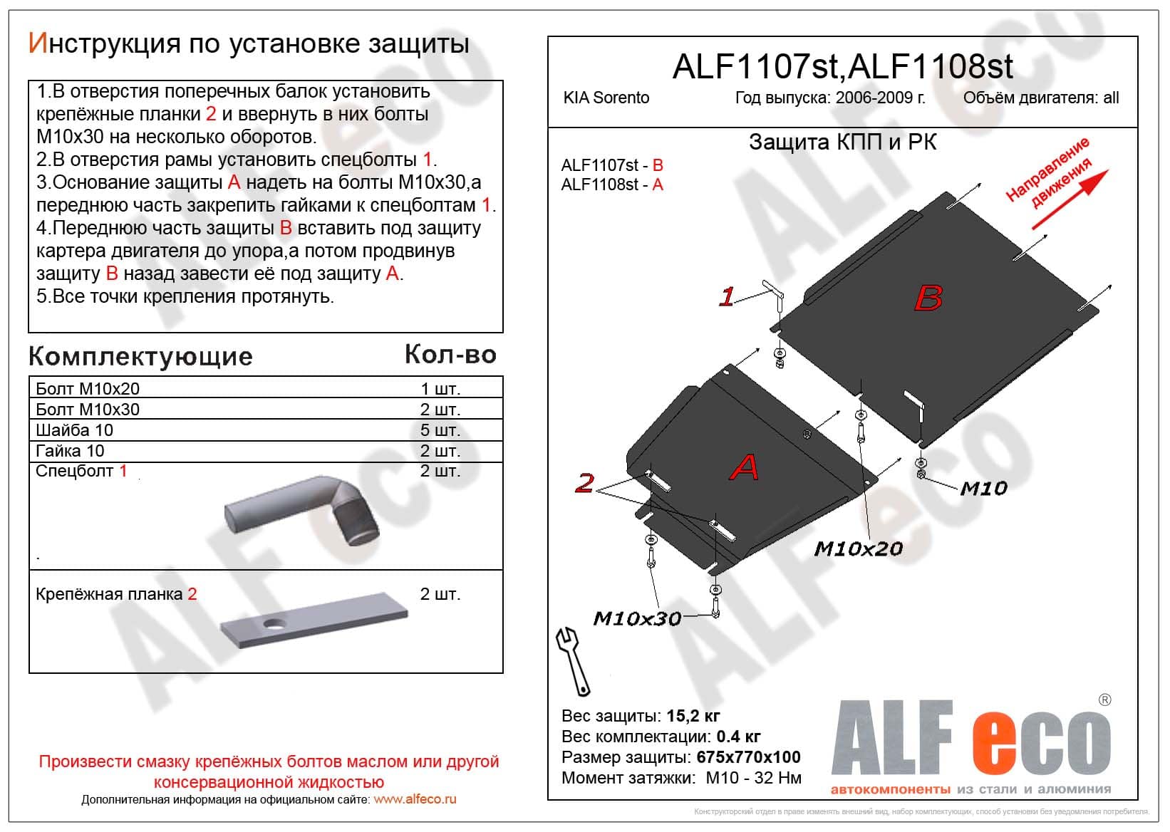 Защита РК ALFeco арт. ALF1108al изготовлена из алюминия толщиной 4мм специально для автомобиля Kia Sorento I JC 2006-2009. Обеспечивает надежную защиту агрегатов от механических повреждений и попадания дорожной грязи и других предметов, встречающихся на проезжей части, способных зачастую нанести серьезный вред автомобилю. В комплекте идет весь необходимый крепеж для установки. Наличие можно уточнить по телефону. Возможна установка в нашем автосервисе по предварительной записи