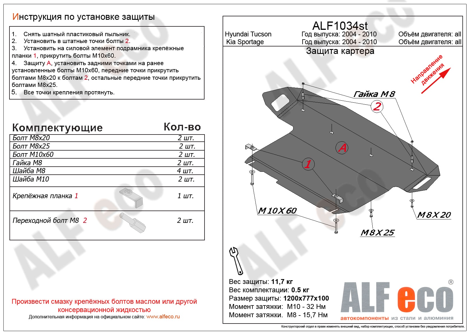 Защита картера и КПП (большая) ALFeco арт. ALF1034al-1 изготовлена из алюминия толщиной 4мм специально для автомобиля Kia Sportage II 2004-2010. Обеспечивает надежную защиту агрегатов от механических повреждений и попадания дорожной грязи и других предметов, встречающихся на проезжей части, способных зачастую нанести серьезный вред автомобилю. В комплекте идет весь необходимый крепеж для установки. Наличие можно уточнить по телефону. Возможна установка в нашем автосервисе по предварительной записи