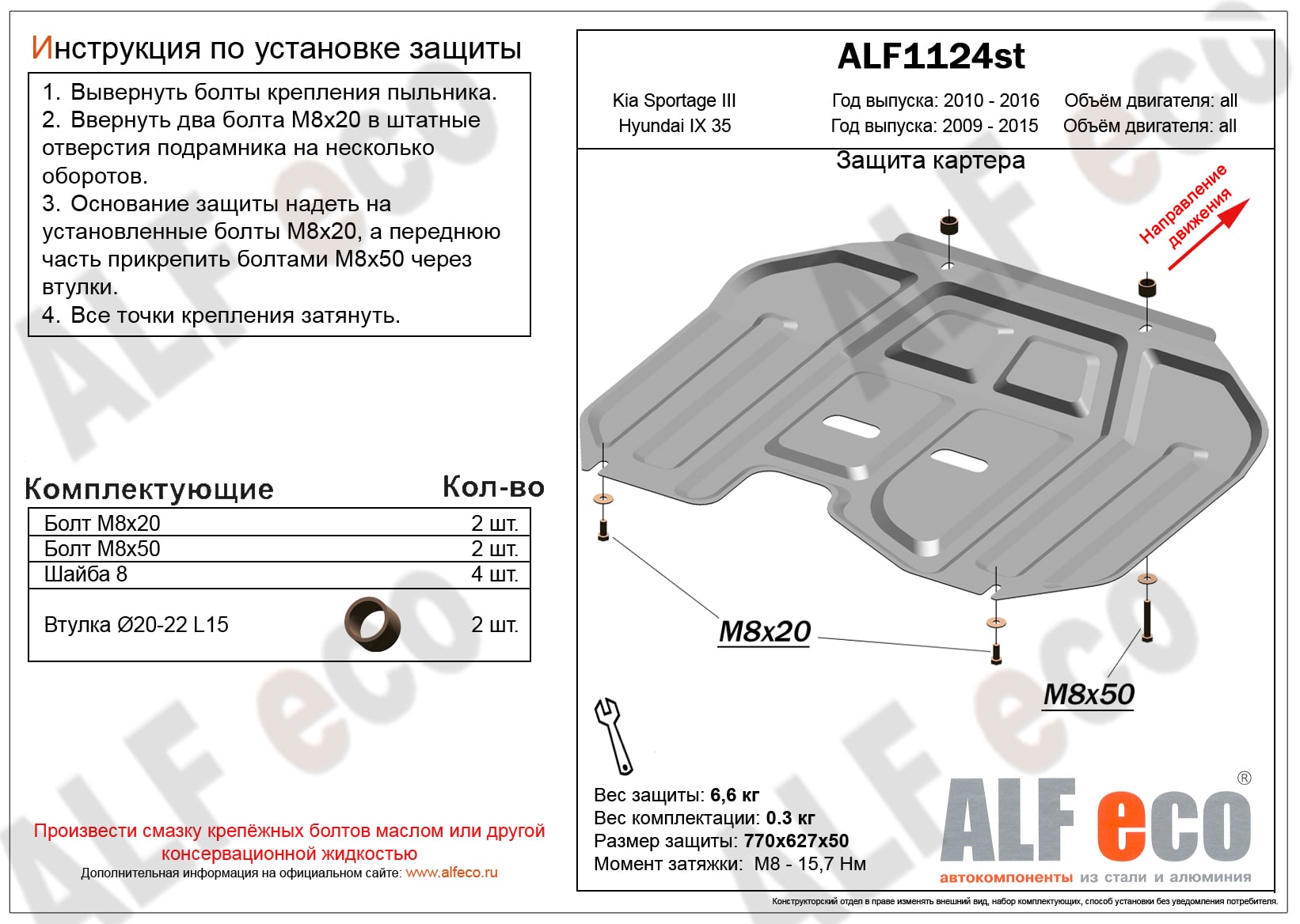 Защита картера и КПП (малая) ALFeco арт. ALF1124al-1 изготовлена из алюминия толщиной 4мм специально для автомобиля Kia Sportage III 2010-2016. Обеспечивает надежную защиту агрегатов от механических повреждений и попадания дорожной грязи и других предметов, встречающихся на проезжей части, способных зачастую нанести серьезный вред автомобилю.