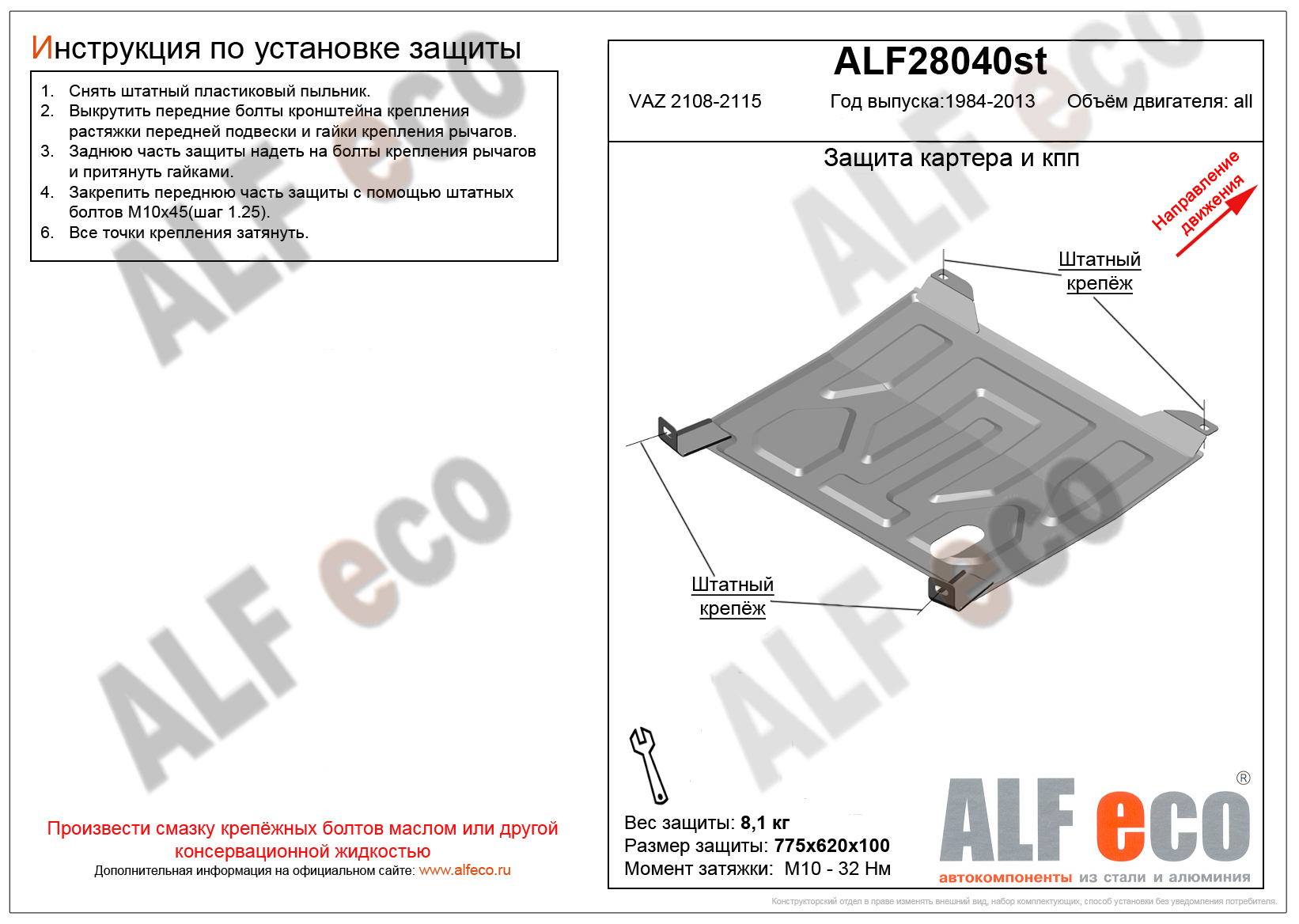 Защита картера и КПП ALFeco арт. ALF28040st изготовлена из стали толщиной 1.5мм специально для автомобиля Vaz 2108/2109/21099/2113/2114/2115 1987-2013. Обеспечивает надежную защиту агрегатов от механических повреждений и попадания дорожной грязи и других предметов, встречающихся на проезжей части, способных зачастую нанести серьезный вред автомобилю. В комплекте идет весь необходимый крепеж для установки. Наличие можно уточнить по телефону. Возможна установка в нашем автосервисе по предварительной записи