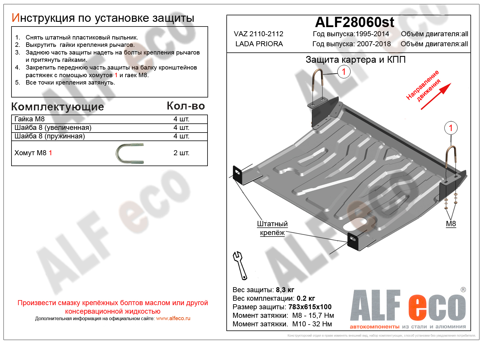 Защита картера и КПП ALFeco арт. ALF28060al изготовлена из алюминия толщиной 4мм специально для автомобиля Vaz 2110/2111/2112 1995-2014. Обеспечивает надежную защиту агрегатов от механических повреждений и попадания дорожной грязи и других предметов, встречающихся на проезжей части, способных зачастую нанести серьезный вред автомобилю. В комплекте идет весь необходимый крепеж для установки. Наличие можно уточнить по телефону. Возможна установка в нашем автосервисе по предварительной записи