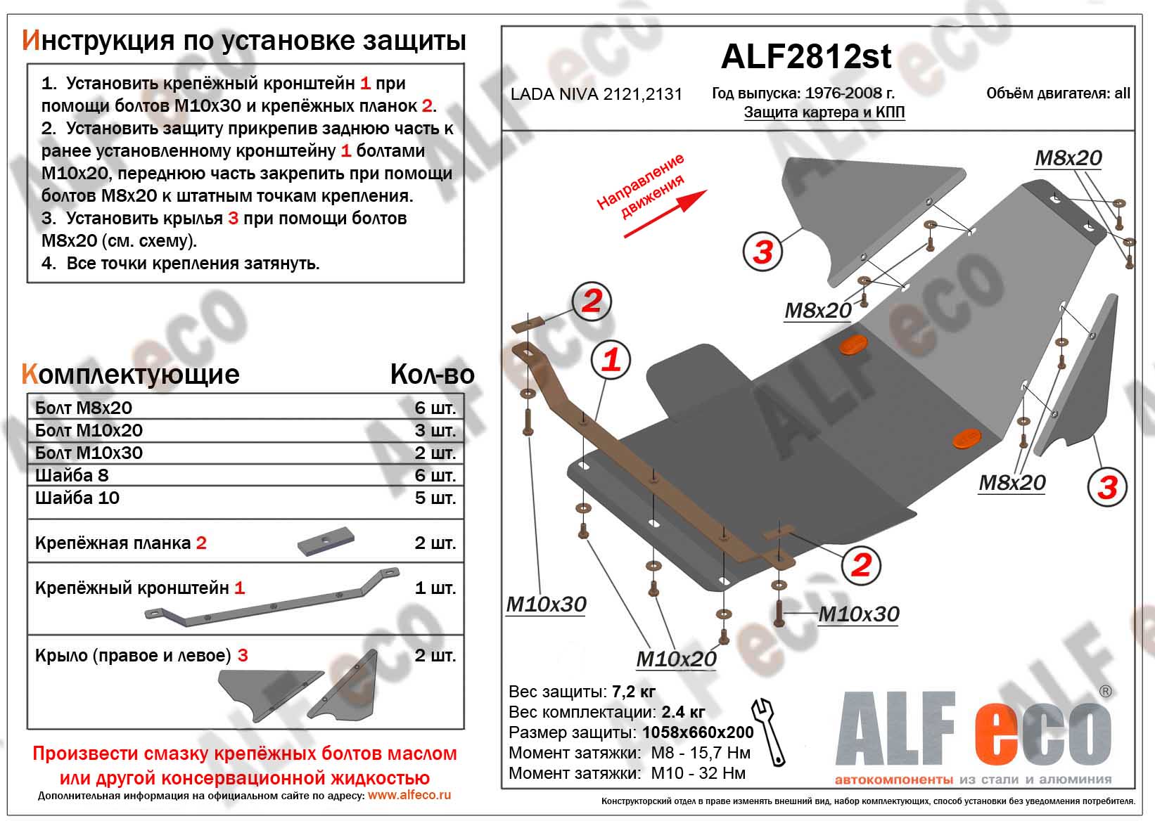 Защита картера и КПП ALFeco арт. ALF2812st изготовлена из стали толщиной 2мм специально для автомобиля Lada Niva 2121 1976-2008. Обеспечивает надежную защиту агрегатов от механических повреждений и попадания дорожной грязи и других предметов, встречающихся на проезжей части, способных зачастую нанести серьезный вред автомобилю. В комплекте идет весь необходимый крепеж для установки. Наличие можно уточнить по телефону. Возможна установка в нашем автосервисе по предварительной записи