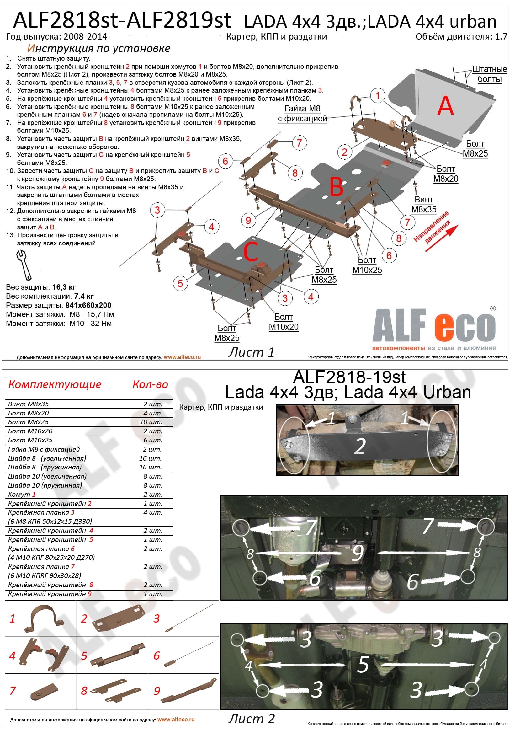 Защита картера и КПП усиленная (2 части) ALFeco арт. ALF2818al-1 изготовлена из алюминия толщиной 4мм специально для автомобиля Lada 4X4 (21214)/URBAN 2016-2021. Обеспечивает надежную защиту агрегатов от механических повреждений и попадания дорожной грязи и других предметов, встречающихся на проезжей части, способных зачастую нанести серьезный вред автомобилю. В комплекте идет весь необходимый крепеж для установки. Наличие можно уточнить по телефону. Возможна установка в нашем автосервисе по предварительной записи