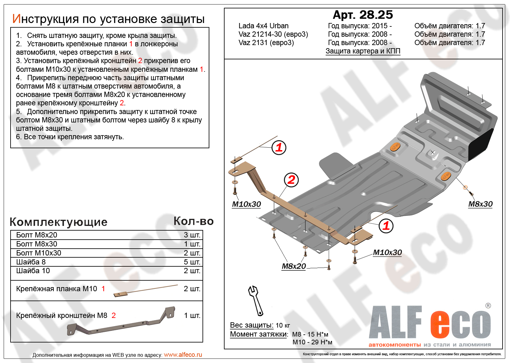 Защита картера и КПП ALFeco арт. ALF2825st-1 изготовлена из стали толщиной 1.5мм специально для автомобиля Lada Niva 2131 (21310) 2008-2016. Обеспечивает надежную защиту агрегатов от механических повреждений и попадания дорожной грязи и других предметов, встречающихся на проезжей части, способных зачастую нанести серьезный вред автомобилю. В комплекте идет весь необходимый крепеж для установки. Наличие можно уточнить по телефону. Возможна установка в нашем автосервисе по предварительной записи