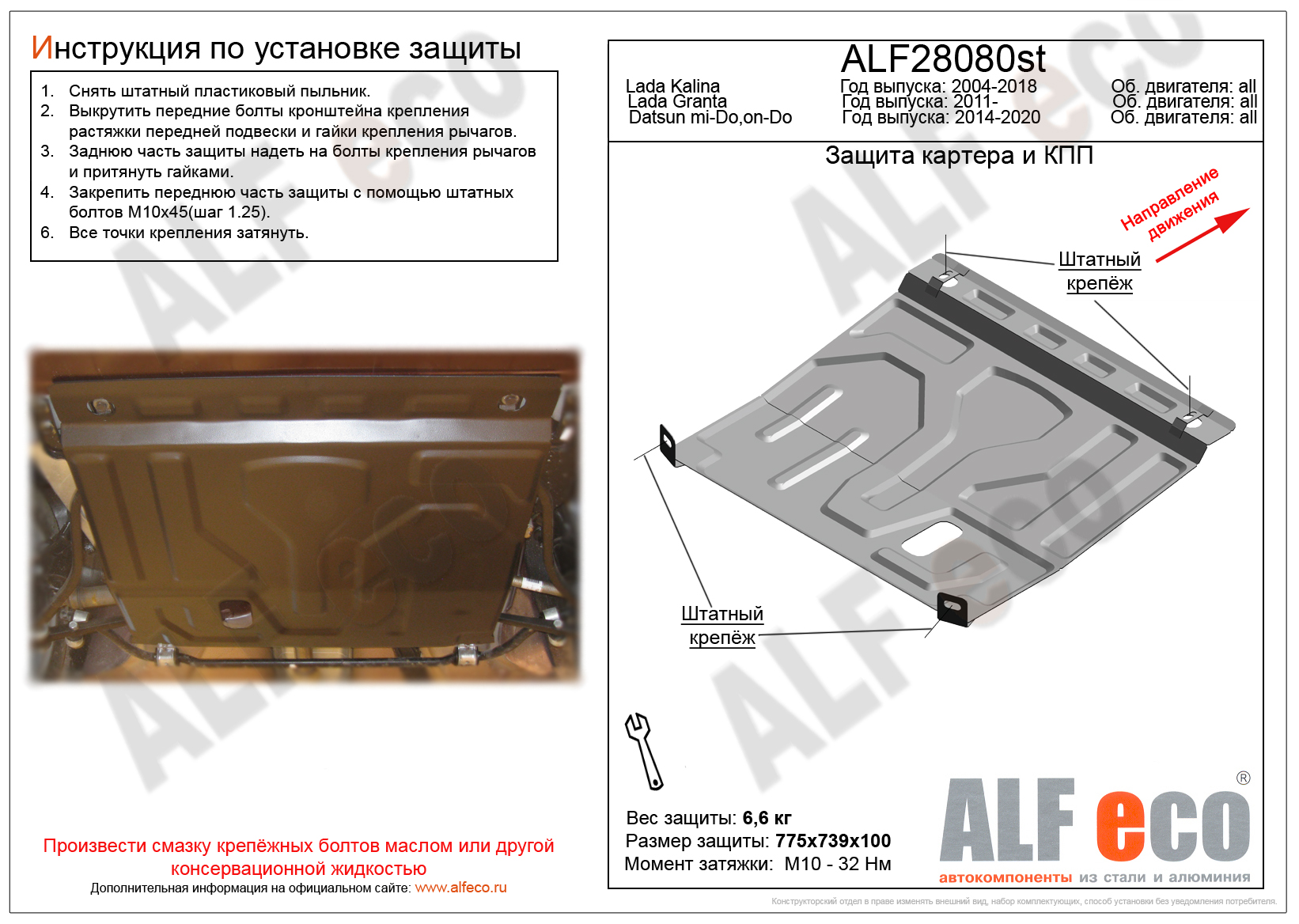 Защита картера и мКПП ALFeco арт. ALF28080st изготовлена из стали толщиной 1.5мм специально для автомобиля Lada Granta 2011-. Обеспечивает надежную защиту агрегатов от механических повреждений и попадания дорожной грязи и других предметов, встречающихся на проезжей части, способных зачастую нанести серьезный вред автомобилю. В комплекте идет весь необходимый крепеж для установки. Наличие можно уточнить по телефону. Возможна установка в нашем автосервисе по предварительной записи