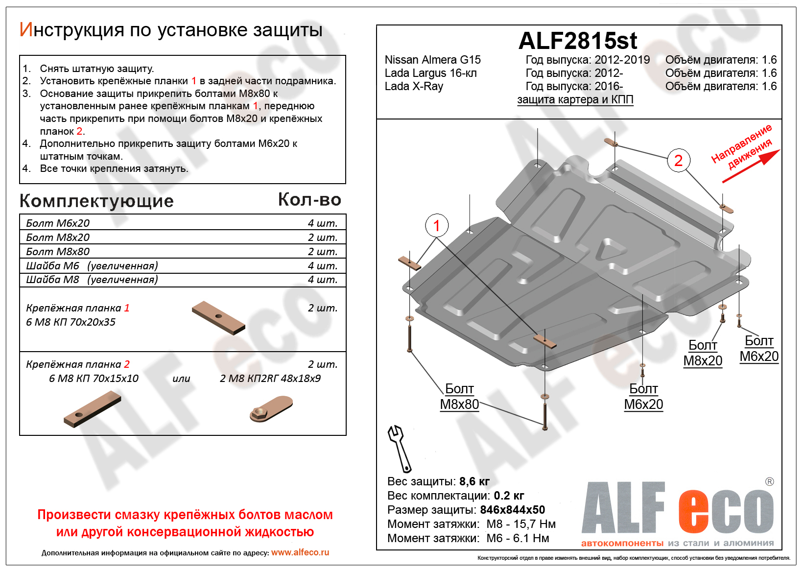 Защита картера и мКПП ALFeco арт. ALF2815al изготовлена из алюминия толщиной 4мм специально для автомобиля Lada Largus 2012-. Обеспечивает надежную защиту агрегатов от механических повреждений и попадания дорожной грязи и других предметов, встречающихся на проезжей части, способных зачастую нанести серьезный вред автомобилю. В комплекте идет весь необходимый крепеж для установки. Наличие можно уточнить по телефону. Возможна установка в нашем автосервисе по предварительной записи