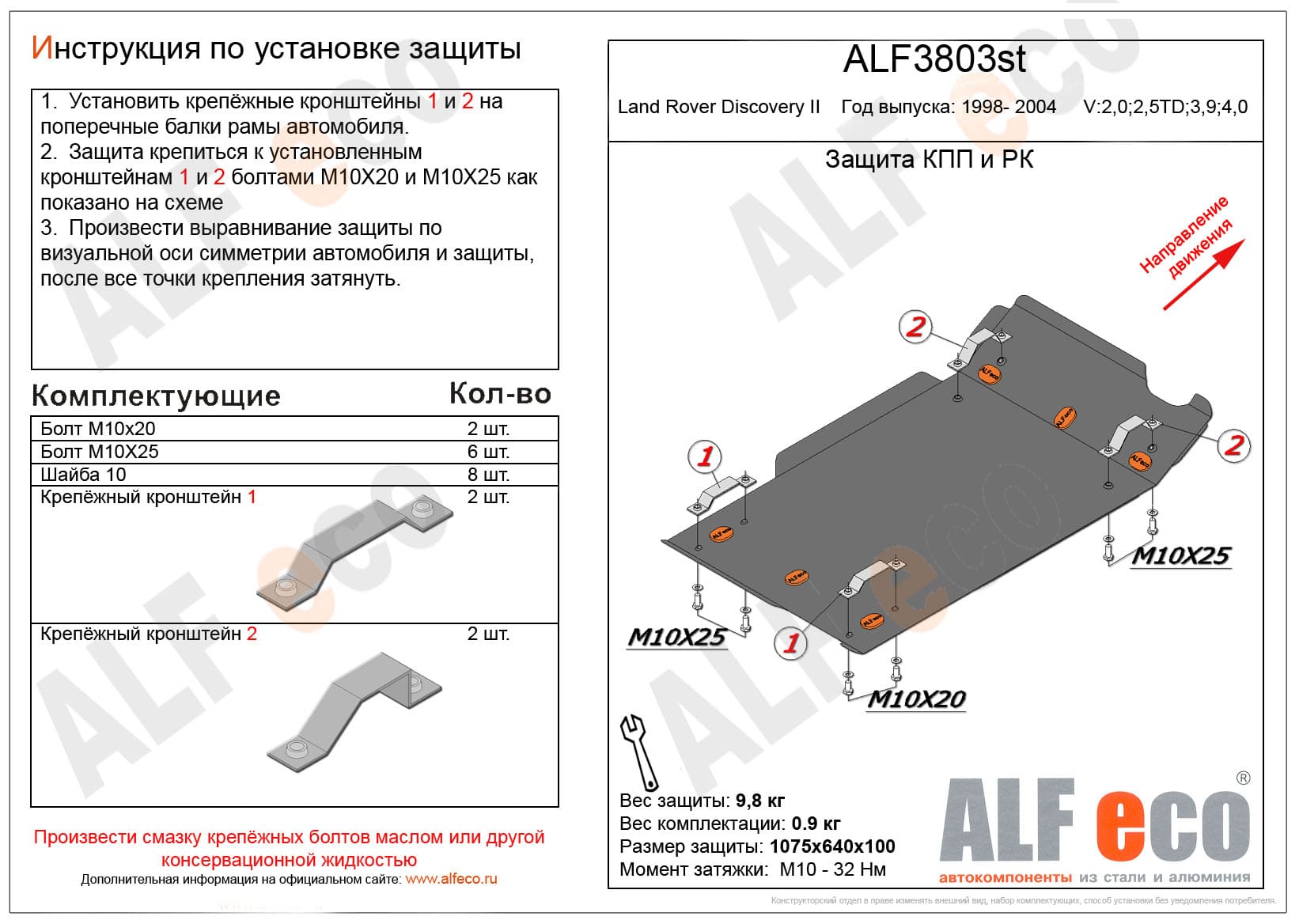 Защита КПП и РК ALFeco арт. ALF3803st изготовлена из стали толщиной 2мм специально для автомобиля Discovery 2 1998-2004. Обеспечивает надежную защиту агрегатов от механических повреждений и попадания дорожной грязи и других предметов, встречающихся на проезжей части, способных зачастую нанести серьезный вред автомобилю. В комплекте идет весь необходимый крепеж для установки. Наличие можно уточнить по телефону. Возможна установка в нашем автосервисе по предварительной записи