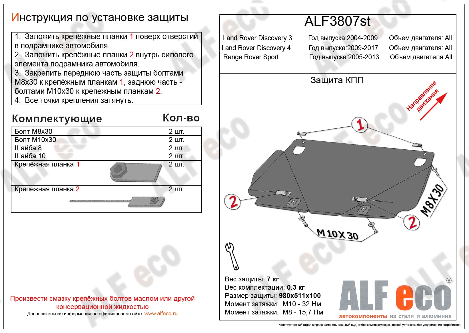 Защита КПП ALFeco арт. ALF3807st изготовлена из стали толщиной 2мм специально для автомобиля Discovery 3 2004-2009. Обеспечивает надежную защиту агрегатов от механических повреждений и попадания дорожной грязи и других предметов, встречающихся на проезжей части, способных зачастую нанести серьезный вред автомобилю. В комплекте идет весь необходимый крепеж для установки. Наличие можно уточнить по телефону. Возможна установка в нашем автосервисе по предварительной записи