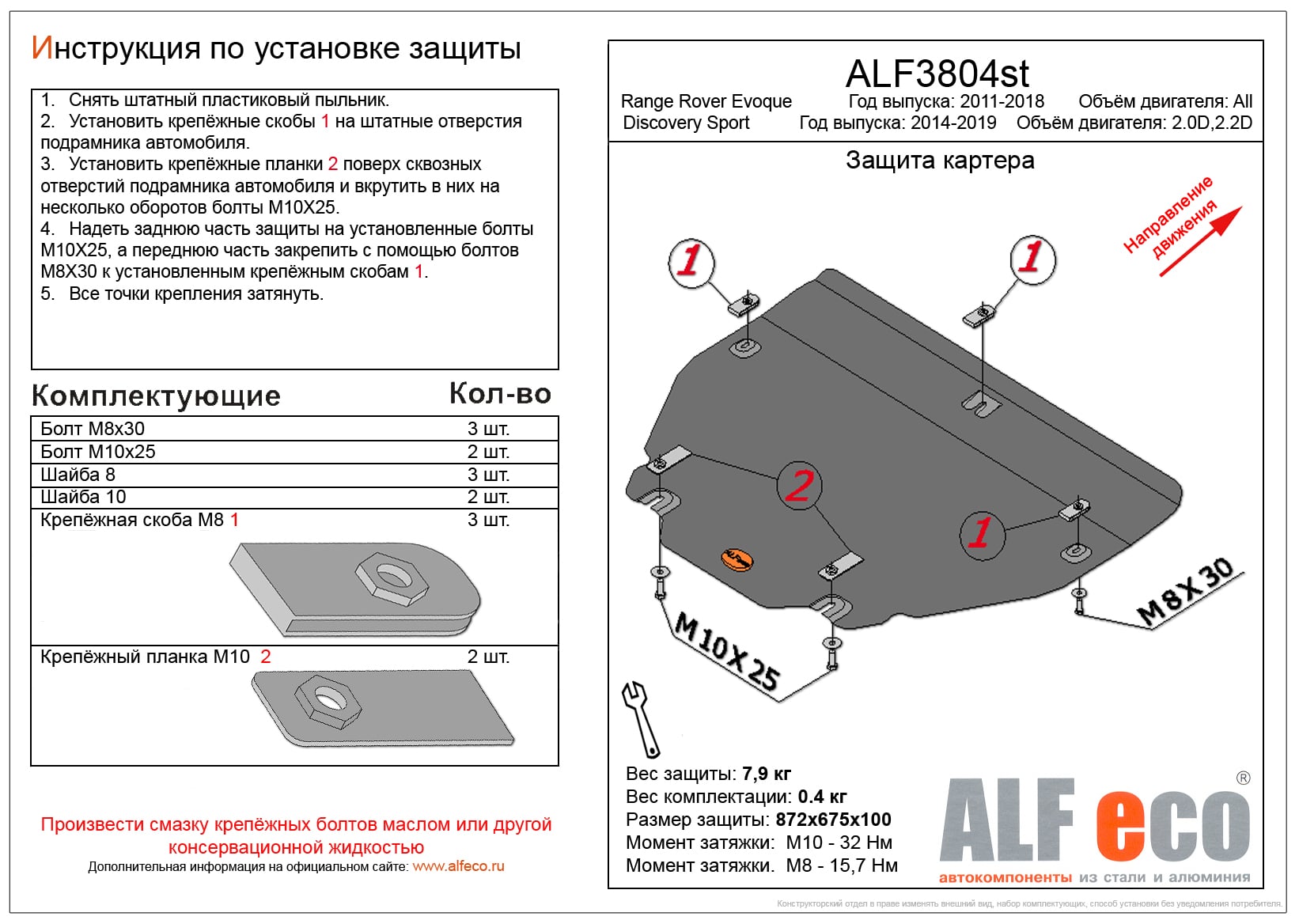 Защита картера и КПП ALFeco арт. ALF3804st-1 изготовлена из стали толщиной 2мм специально для автомобиля Discovery Sport 2014-2019. Обеспечивает надежную защиту агрегатов от механических повреждений и попадания дорожной грязи и других предметов, встречающихся на проезжей части, способных зачастую нанести серьезный вред автомобилю. В комплекте идет весь необходимый крепеж для установки. Наличие можно уточнить по телефону. Возможна установка в нашем автосервисе по предварительной записи