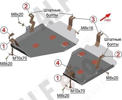 Защита топливного бака(2 части) ALFeco арт. ALF3814st изготовлена из стали толщиной 2мм специально для автомобиля Discovery Sport 2014-2019. Обеспечивает надежную защиту агрегатов от механических повреждений и попадания дорожной грязи и других предметов, встречающихся на проезжей части, способных зачастую нанести серьезный вред автомобилю.