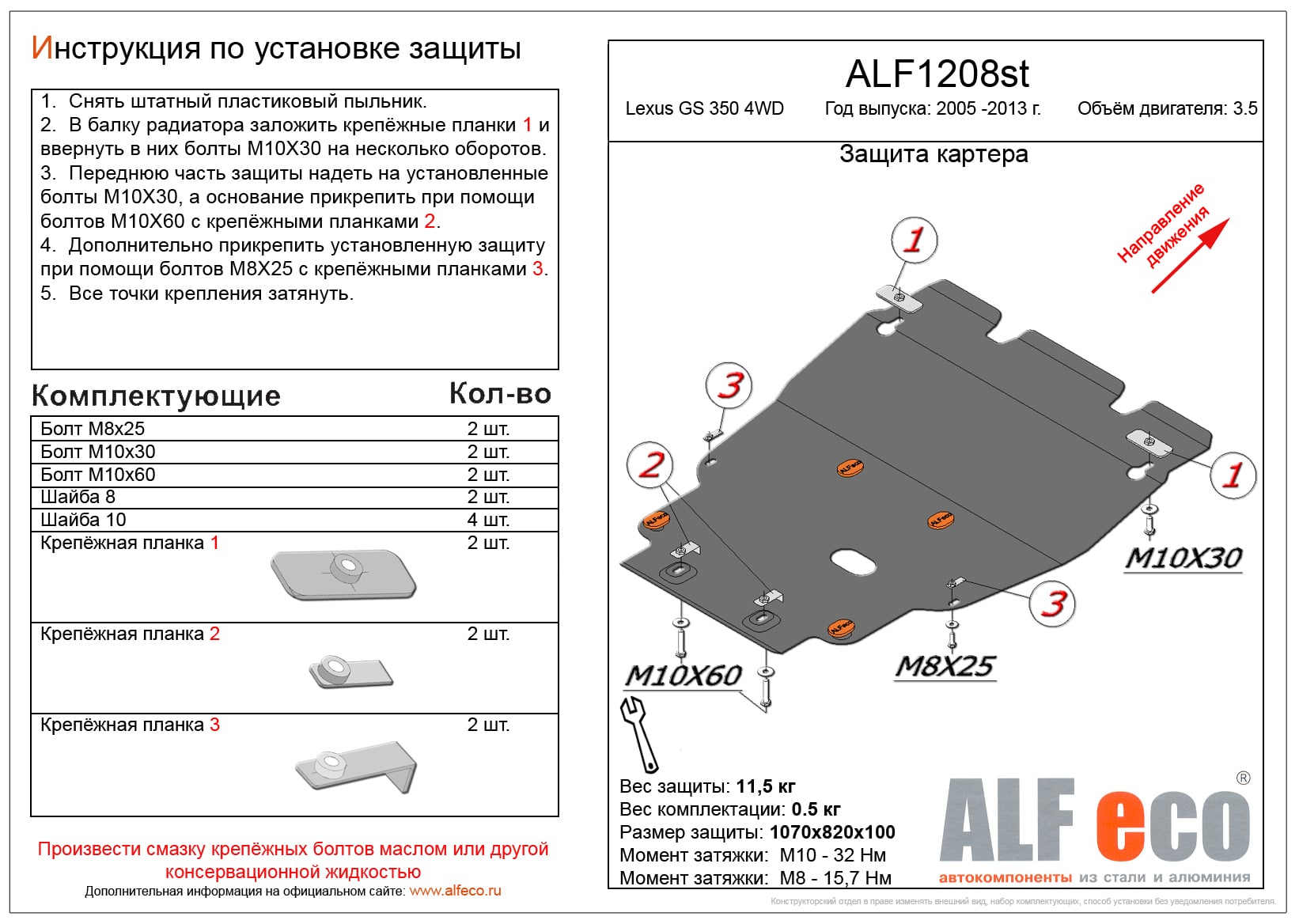 Защита картера и КПП (установка без пыльника) ALFeco арт. ALF1208al изготовлена из алюминия толщиной 4мм специально для автомобиля Lexus GS350 4WD 2005-2013. Обеспечивает надежную защиту агрегатов от механических повреждений и попадания дорожной грязи и других предметов, встречающихся на проезжей части, способных зачастую нанести серьезный вред автомобилю. В комплекте идет весь необходимый крепеж для установки. Наличие можно уточнить по телефону. Возможна установка в нашем автосервисе по предварительной записи