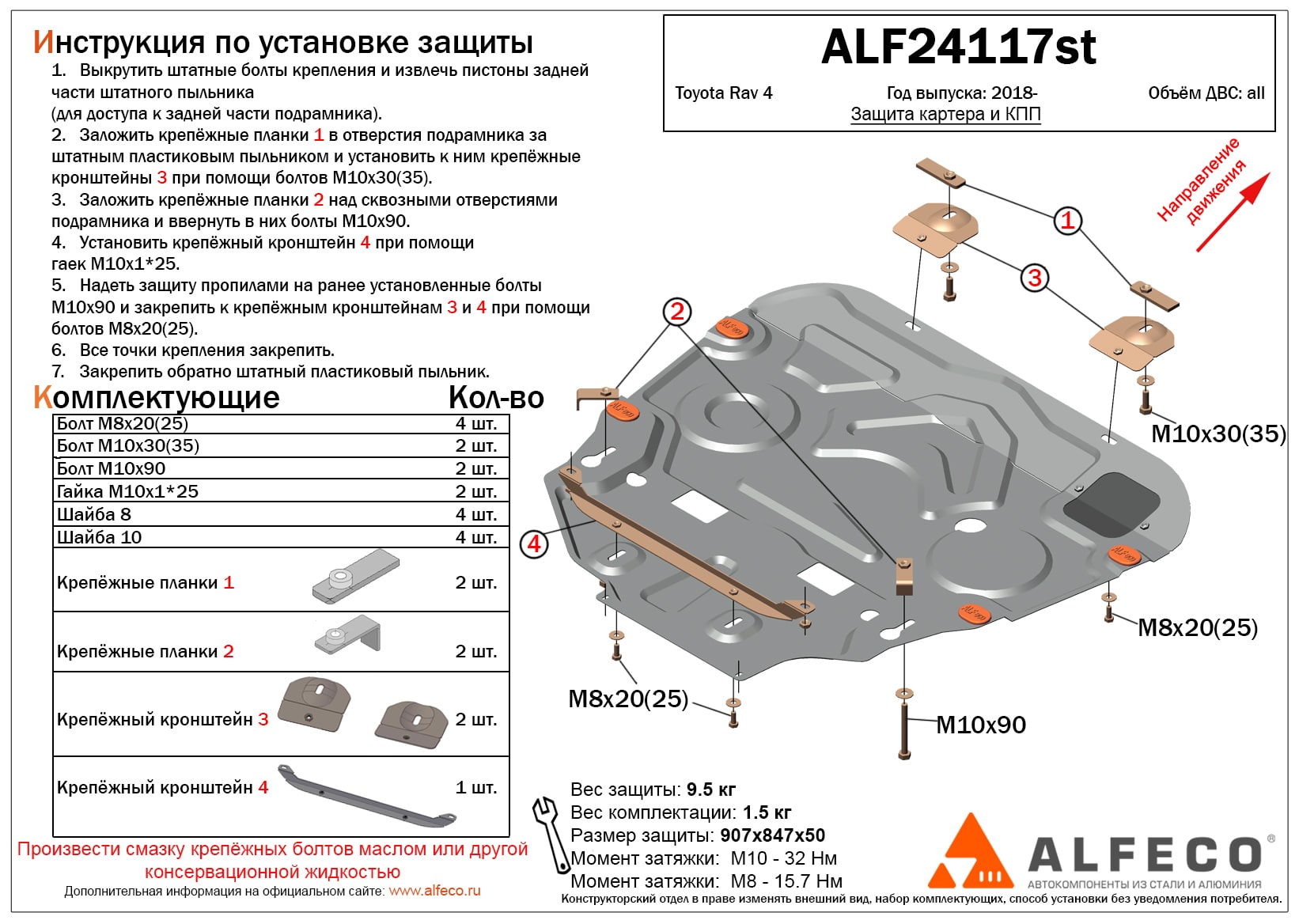 Защита картера и АКПП ALFeco арт. ALF24117st-3 изготовлена из стали толщиной 2 мм специально для автомобиля Lexus RX 350 2022- . Обеспечивает надежную защиту агрегатов от механических повреждений и попадания дорожной грязи и других предметов, встречающихся на проезжей части, способных зачастую нанести серьезный вред автомобилю. В комплекте идет весь необходимый крепеж для установки. Наличие можно уточнить по телефону. Возможна установка в нашем автосервисе по предварительной записи