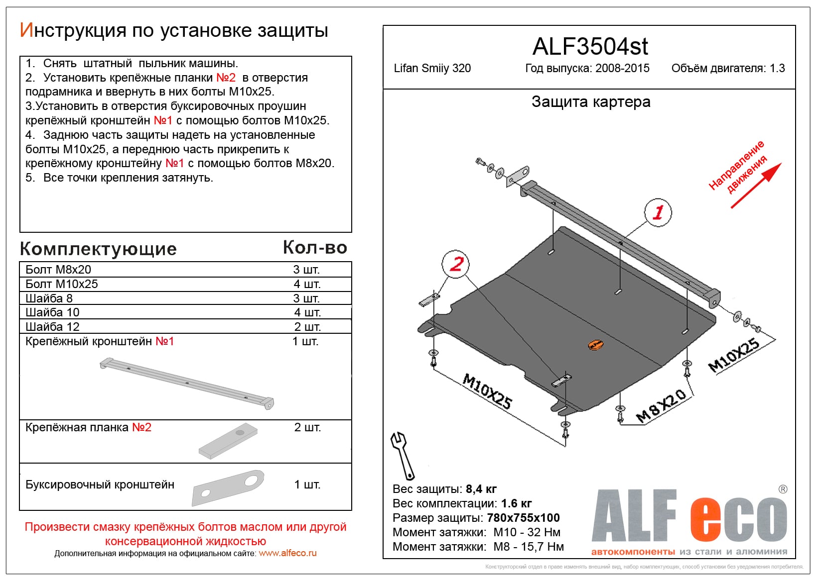 Защита картера и КПП ALFeco арт. ALF3504st изготовлена из стали толщиной 1.5мм специально для автомобиля Lifan Smily 320 2010-2016. Обеспечивает надежную защиту агрегатов от механических повреждений и попадания дорожной грязи и других предметов, встречающихся на проезжей части, способных зачастую нанести серьезный вред автомобилю. В комплекте идет весь необходимый крепеж для установки. Наличие можно уточнить по телефону. Возможна установка в нашем автосервисе по предварительной записи