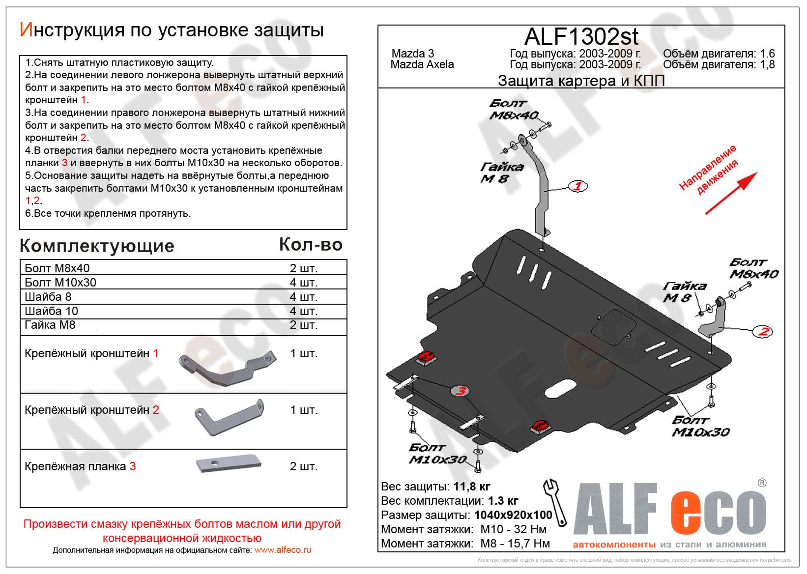 Защита картера и КПП ALFeco арт. ALF1302st изготовлена из стали толщиной 2мм специально для автомобиля Mazda 3 2003-2009. Обеспечивает надежную защиту агрегатов от механических повреждений и попадания дорожной грязи и других предметов, встречающихся на проезжей части, способных зачастую нанести серьезный вред автомобилю. В комплекте идет весь необходимый крепеж для установки. Наличие можно уточнить по телефону. Возможна установка в нашем автосервисе по предварительной записи