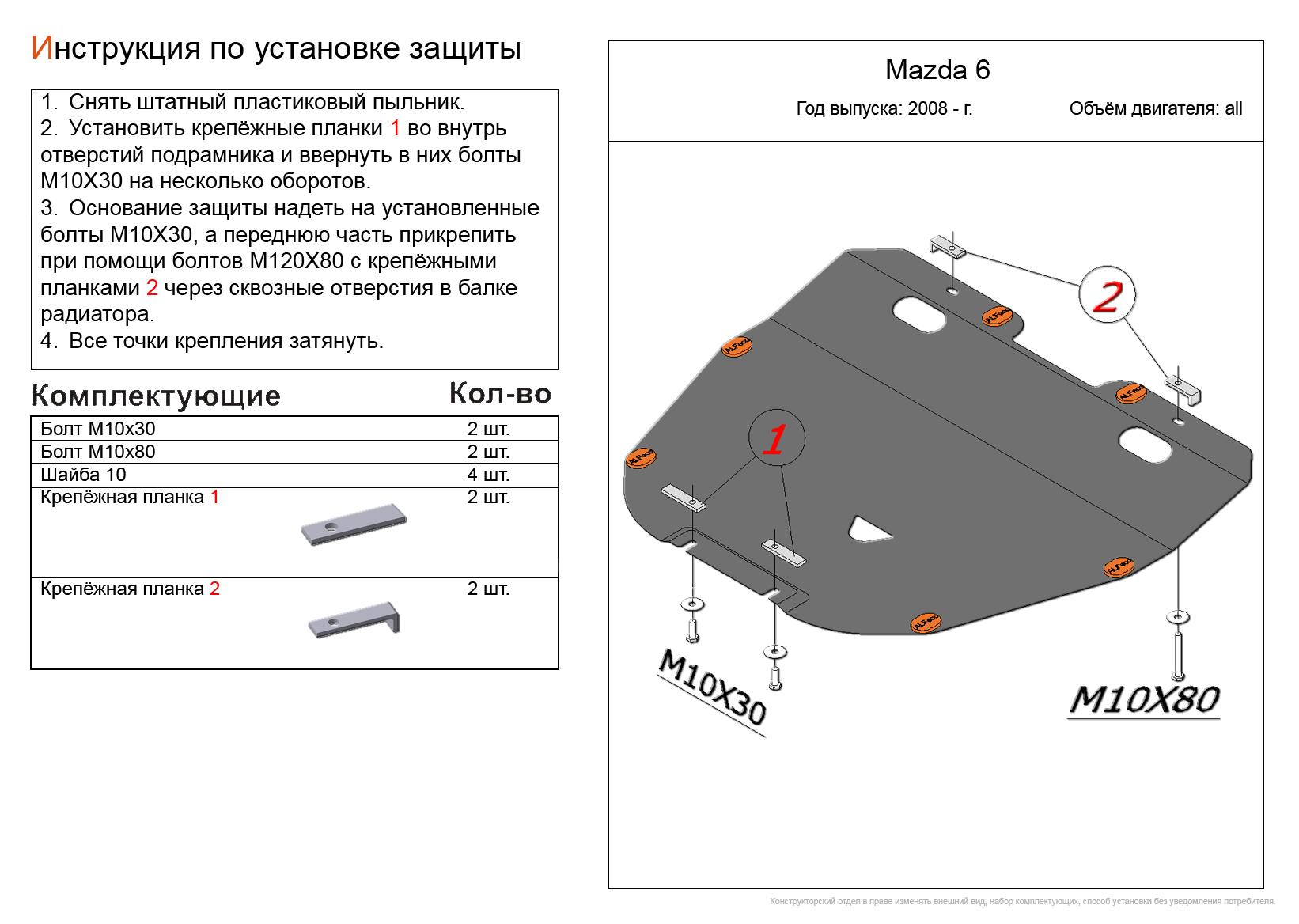 Защита картера и КПП ALFeco арт. ALF1305al-1 изготовлена из алюминия толщиной 4мм специально для автомобиля Mazda Atenza GH 2008-2012. Обеспечивает надежную защиту агрегатов от механических повреждений и попадания дорожной грязи и других предметов, встречающихся на проезжей части, способных зачастую нанести серьезный вред автомобилю. В комплекте идет весь необходимый крепеж для установки. Наличие можно уточнить по телефону. Возможна установка в нашем автосервисе по предварительной записи