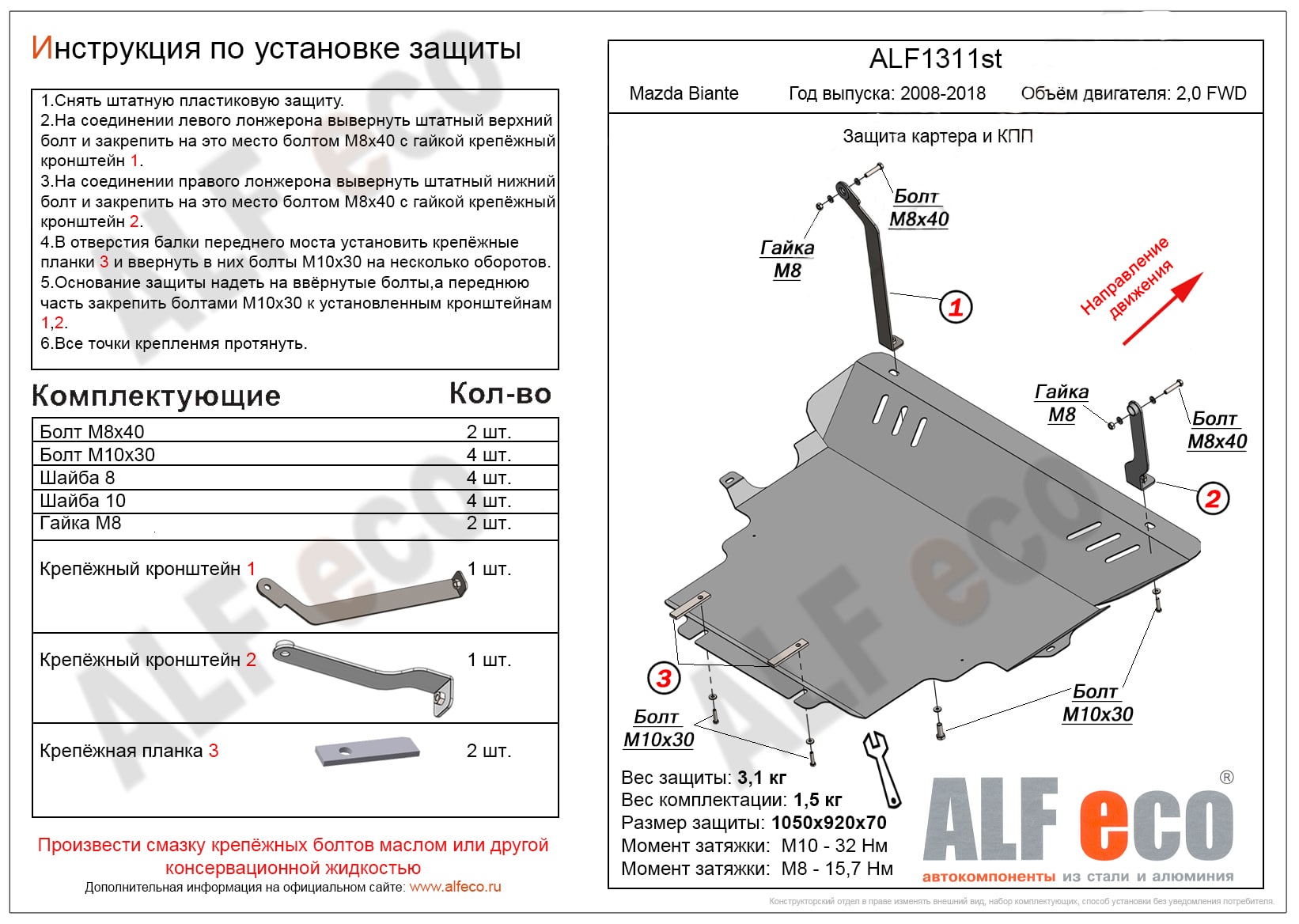 Защита картера и КПП ALFeco арт. ALF1311st изготовлена из стали толщиной 2мм специально для автомобиля Mazda Biante 2008-2018. Обеспечивает надежную защиту агрегатов от механических повреждений и попадания дорожной грязи и других предметов, встречающихся на проезжей части, способных зачастую нанести серьезный вред автомобилю. В комплекте идет весь необходимый крепеж для установки. Наличие можно уточнить по телефону. Возможна установка в нашем автосервисе по предварительной записи