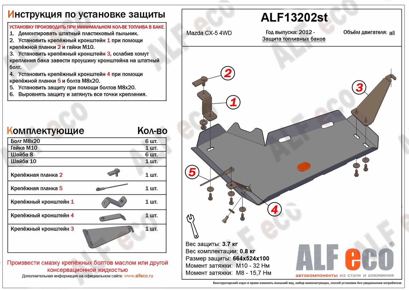 Защита топливного бака ( правая сторона) ALFeco арт. ALF13202al изготовлена из алюминия толщиной 4мм специально для автомобиля Mazda CX-5 2012-. Обеспечивает надежную защиту агрегатов от механических повреждений и попадания дорожной грязи и других предметов, встречающихся на проезжей части, способных зачастую нанести серьезный вред автомобилю. В комплекте идет весь необходимый крепеж для установки. Наличие можно уточнить по телефону. Возможна установка в нашем автосервисе по предварительной записи