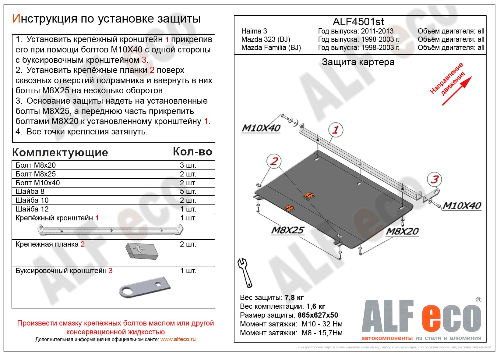 Защита картера и КПП ALFeco арт. ALF4501al-1 изготовлена из алюминия толщиной 4мм специально для автомобиля Mazda Familia (BJ) 1998-2003. Обеспечивает надежную защиту агрегатов от механических повреждений и попадания дорожной грязи и других предметов, встречающихся на проезжей части, способных зачастую нанести серьезный вред автомобилю. В комплекте идет весь необходимый крепеж для установки. Наличие можно уточнить по телефону. Возможна установка в нашем автосервисе по предварительной записи