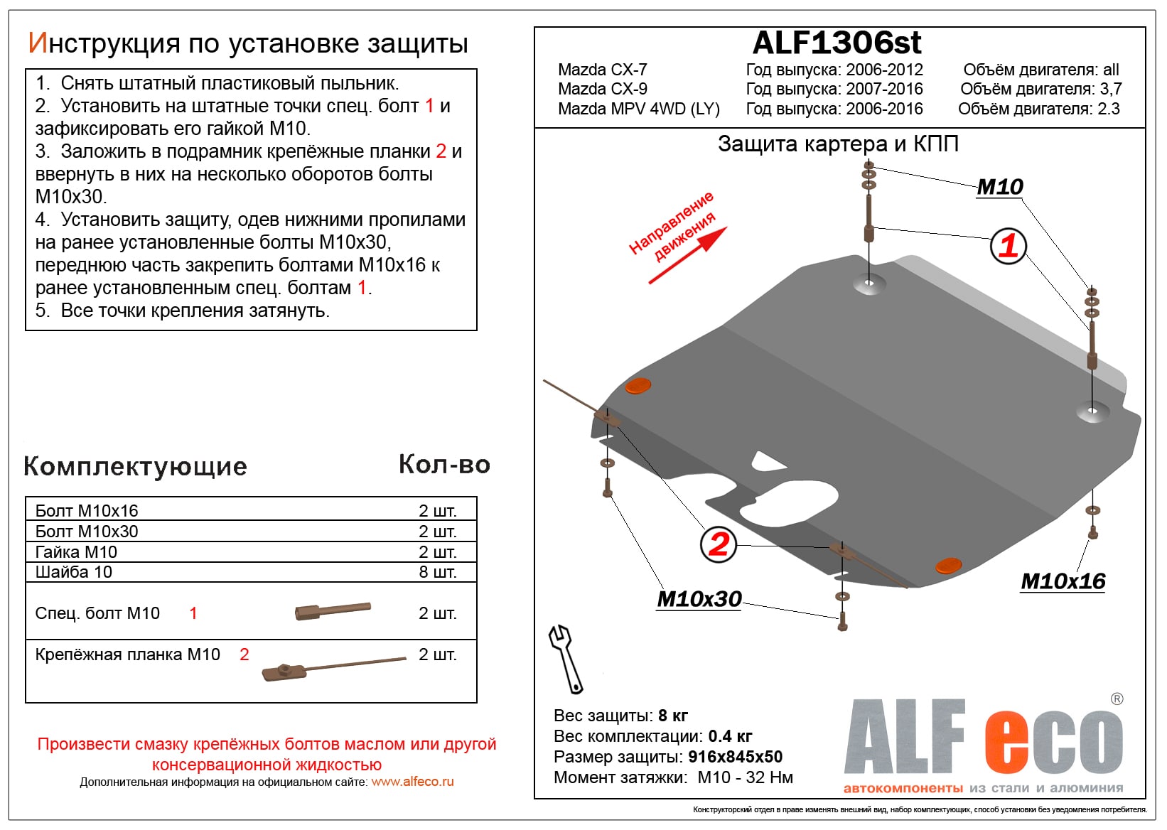 Защита картера и КПП ALFeco арт. ALF1306al-2 изготовлена из алюминия толщиной 4мм специально для автомобиля Mazda MPV (LY)4WD 2006-2016. Обеспечивает надежную защиту агрегатов от механических повреждений и попадания дорожной грязи и других предметов, встречающихся на проезжей части, способных зачастую нанести серьезный вред автомобилю. В комплекте идет весь необходимый крепеж для установки. Наличие можно уточнить по телефону. Возможна установка в нашем автосервисе по предварительной записи