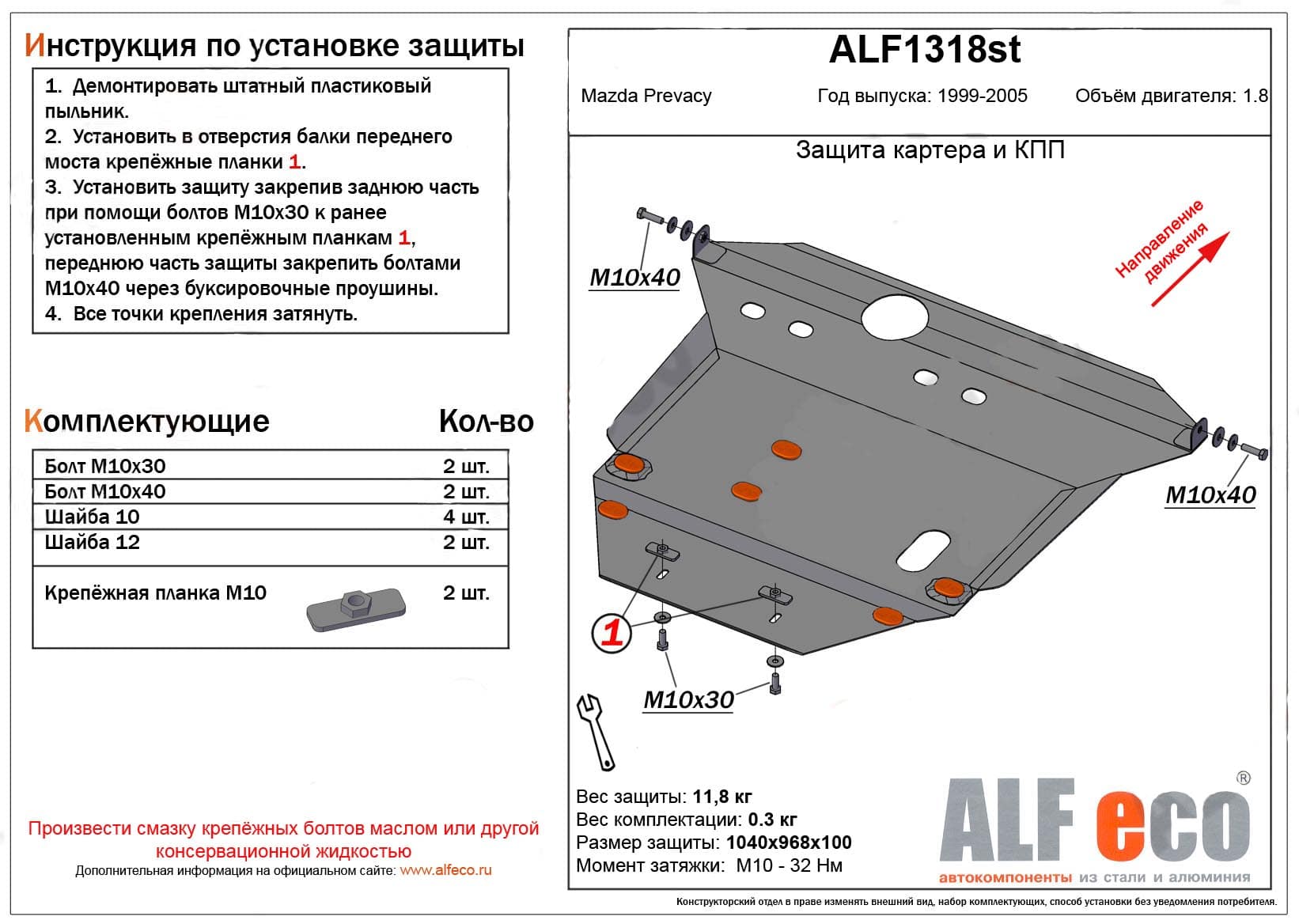 Защита картера и КПП ALFeco арт. ALF1318al изготовлена из алюминия толщиной 4мм специально для автомобиля Mazda Premacy G1 1999-2004. Обеспечивает надежную защиту агрегатов от механических повреждений и попадания дорожной грязи и других предметов, встречающихся на проезжей части, способных зачастую нанести серьезный вред автомобилю. В комплекте идет весь необходимый крепеж для установки. Наличие можно уточнить по телефону. Возможна установка в нашем автосервисе по предварительной записи